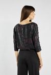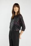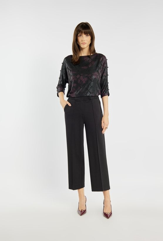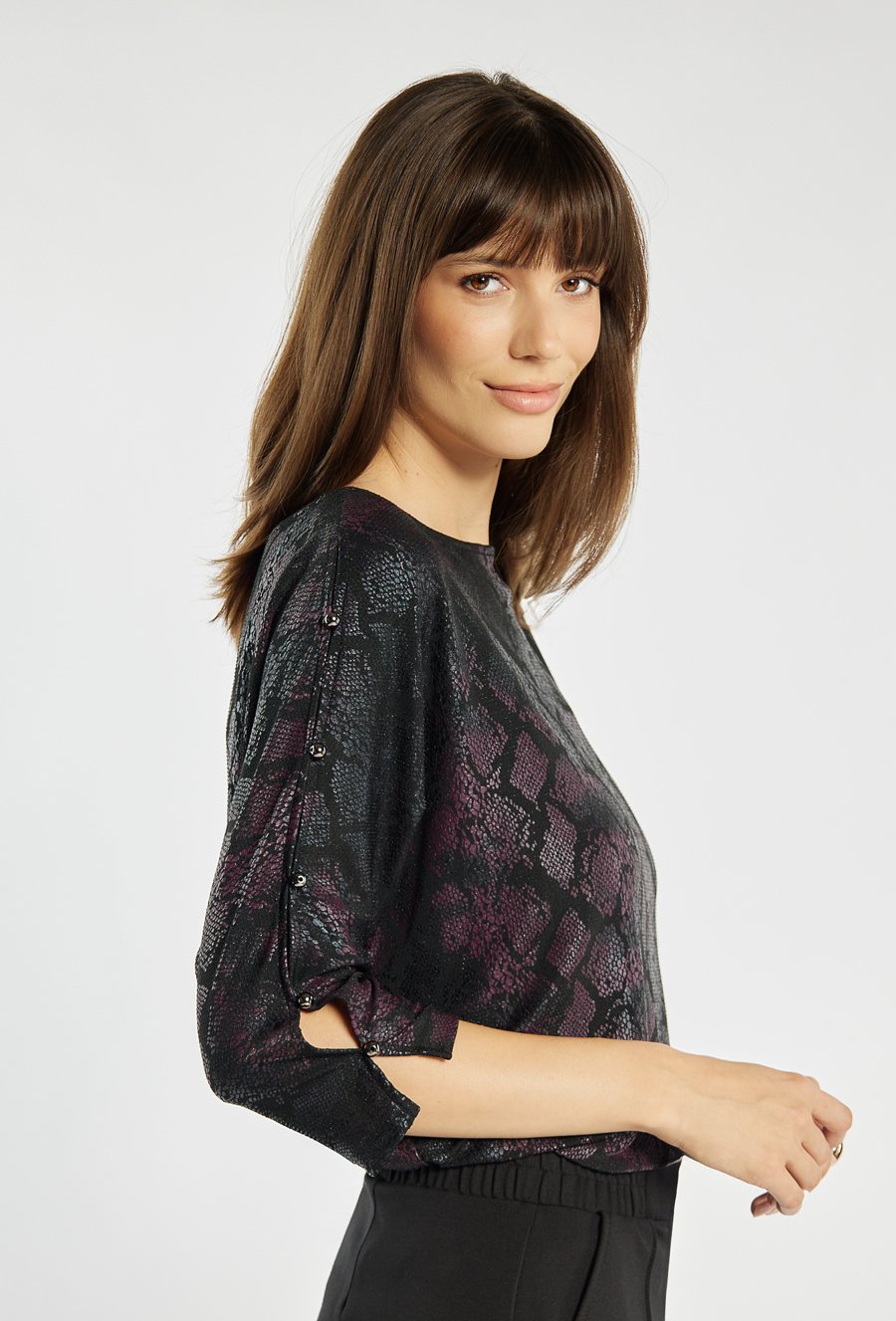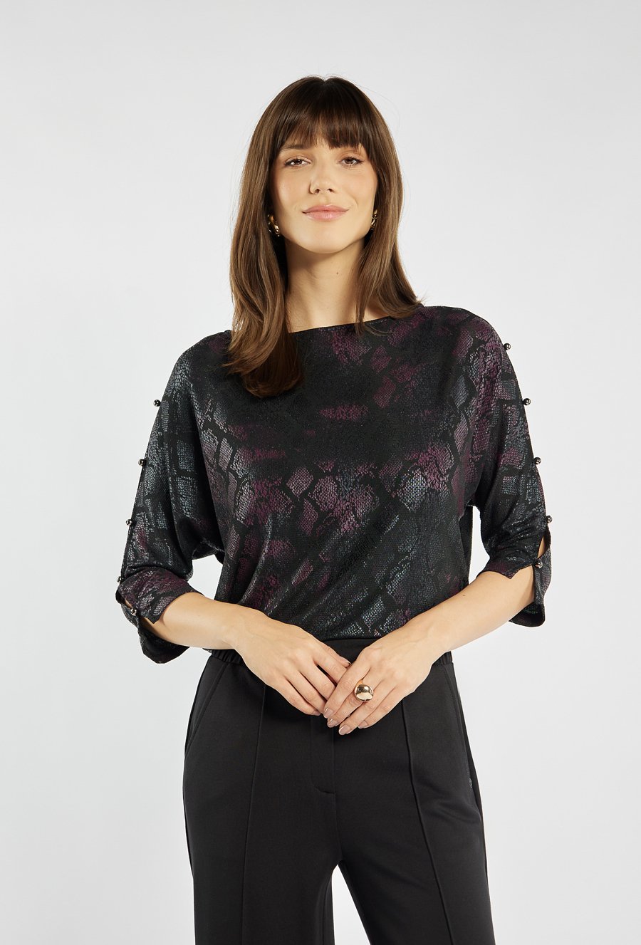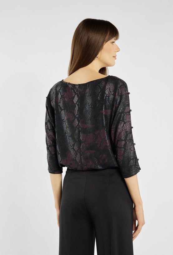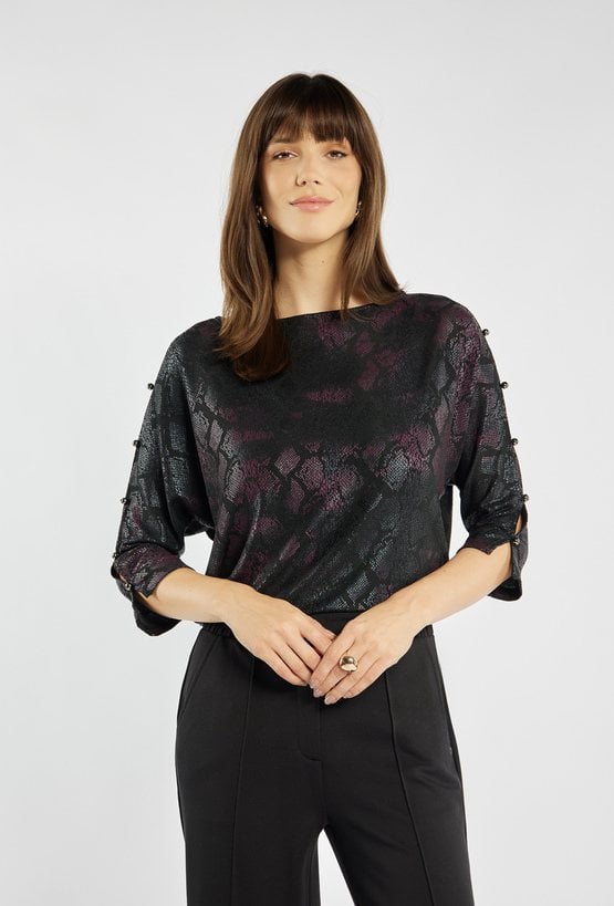 Bluzka o oryginalnym, metalicznym wykończeniu z subtelnym motywem wężowej skóry w odcieniach czerni i burgundu. Rękawy 3/4 z ozdobnymi rozcięciami i eleganckimi guziczkami nadają jej wyjątkowego charakteru. Luźniejszy fason zapewnia komfort i swobodę ruchów, jednocześnie prezentując się bardzo szykownie. To idealny wybór na wieczorne spotkania, święta czy sylwestrowe przyjęcie. Modelka na zdjęciu ma 177 cm wzrostu i prezentuje rozmiar S.