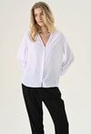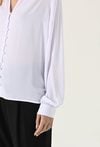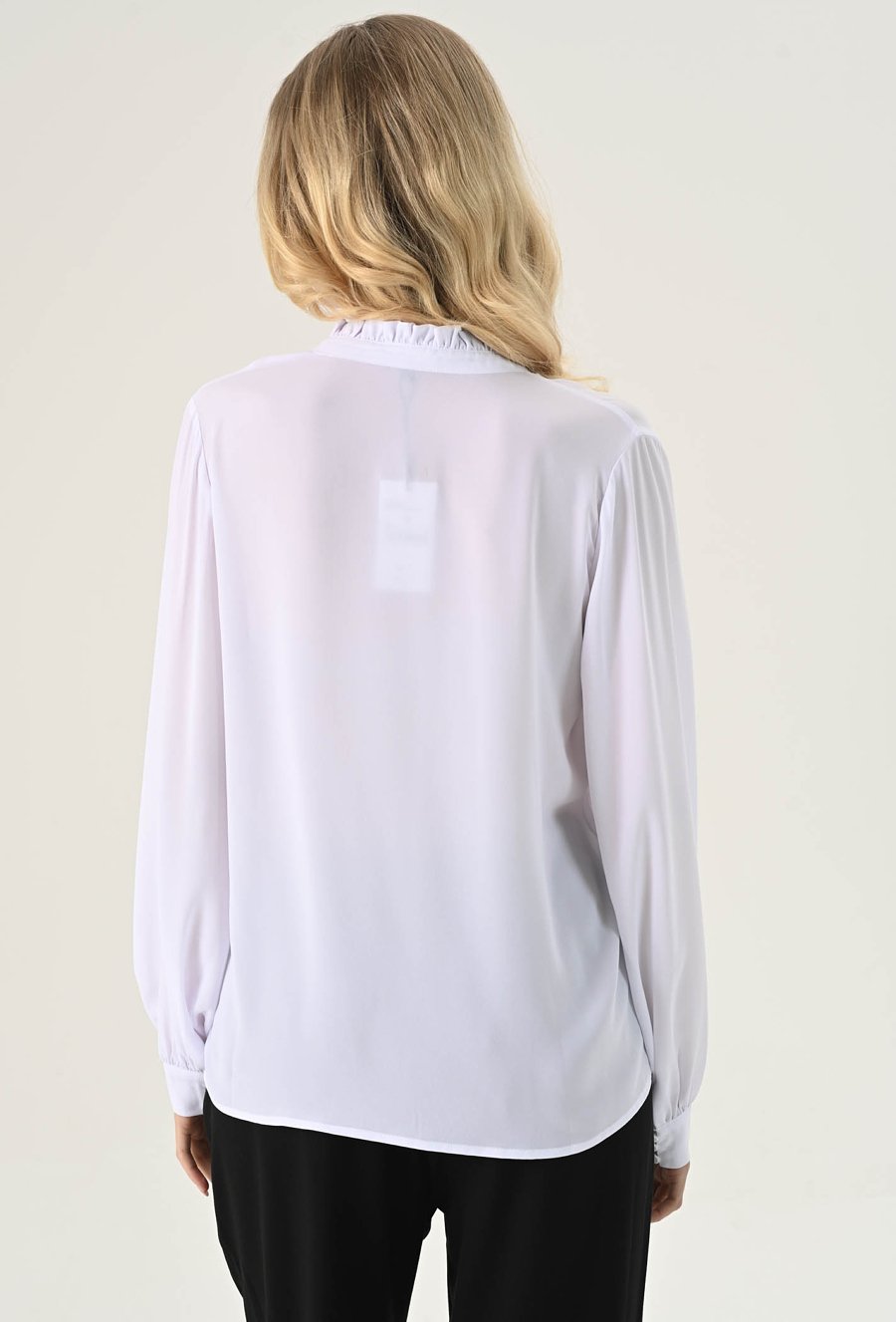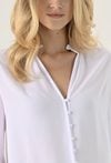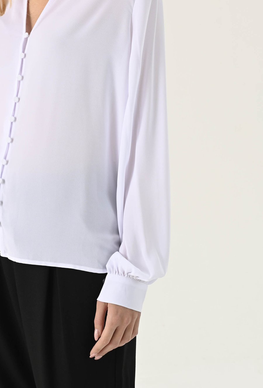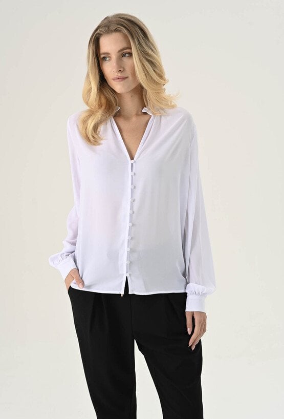 Elegancka bluzka w białaym kolorze zakończonym szerokim mankietem. Dekolt w kształcie litery V, zapinana na eleganckie, ozdobne guziki, która dodaje jej z dodają jej kobiecego szyku. Wykonana z lekkiej tkaniny, jest wyjątkowo szykowną propozycją do eleganckich zestawów a wysoko kontrastowy wzór idealnie dopełni każdą stylizację. Modelka na zdjęciu ma 174 cm wzrostu i prezentuje rozmiar 36.