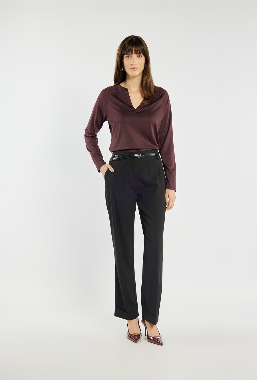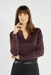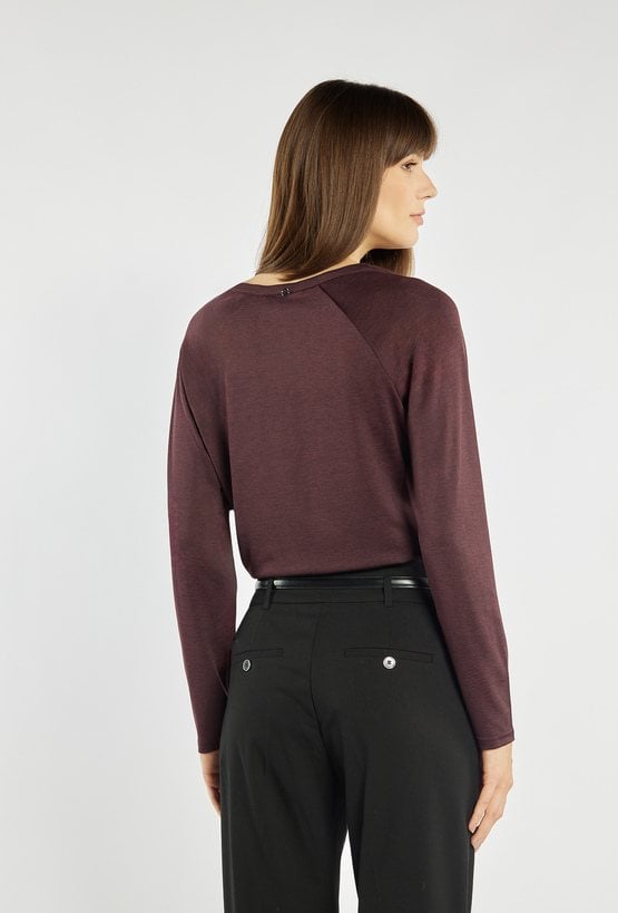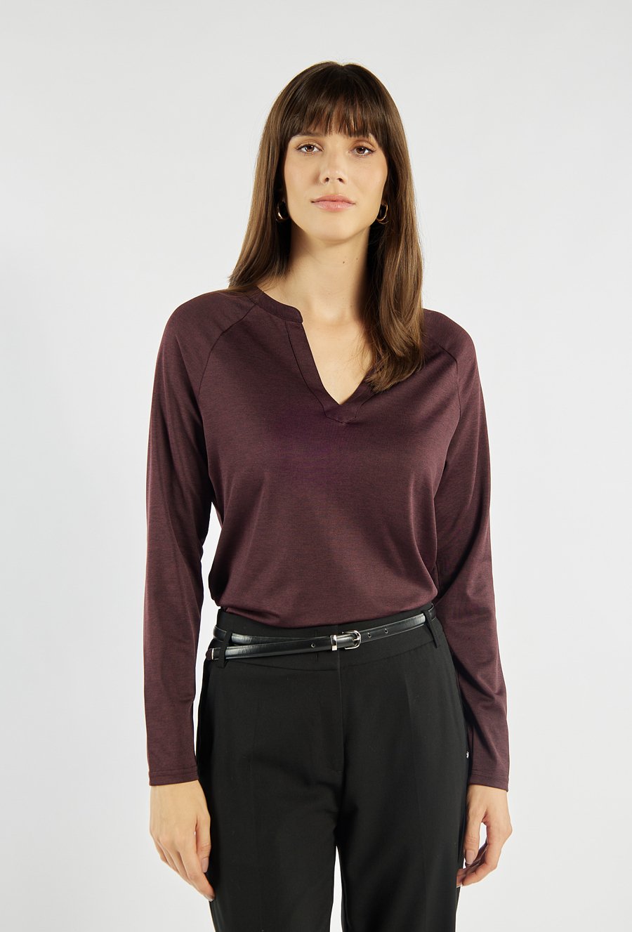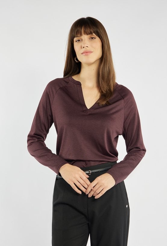 Bluzka z długim rękawem i subtelnym dekoltem w kształcie litery V. Minimalistyczny design sprawia, że doskonale sprawdzi się zarówno w stylizacjach codziennych, jak i bardziej formalnych. Modelka na zdjęciu ma 177 cm wzrostu i prezentuje rozmiar S