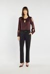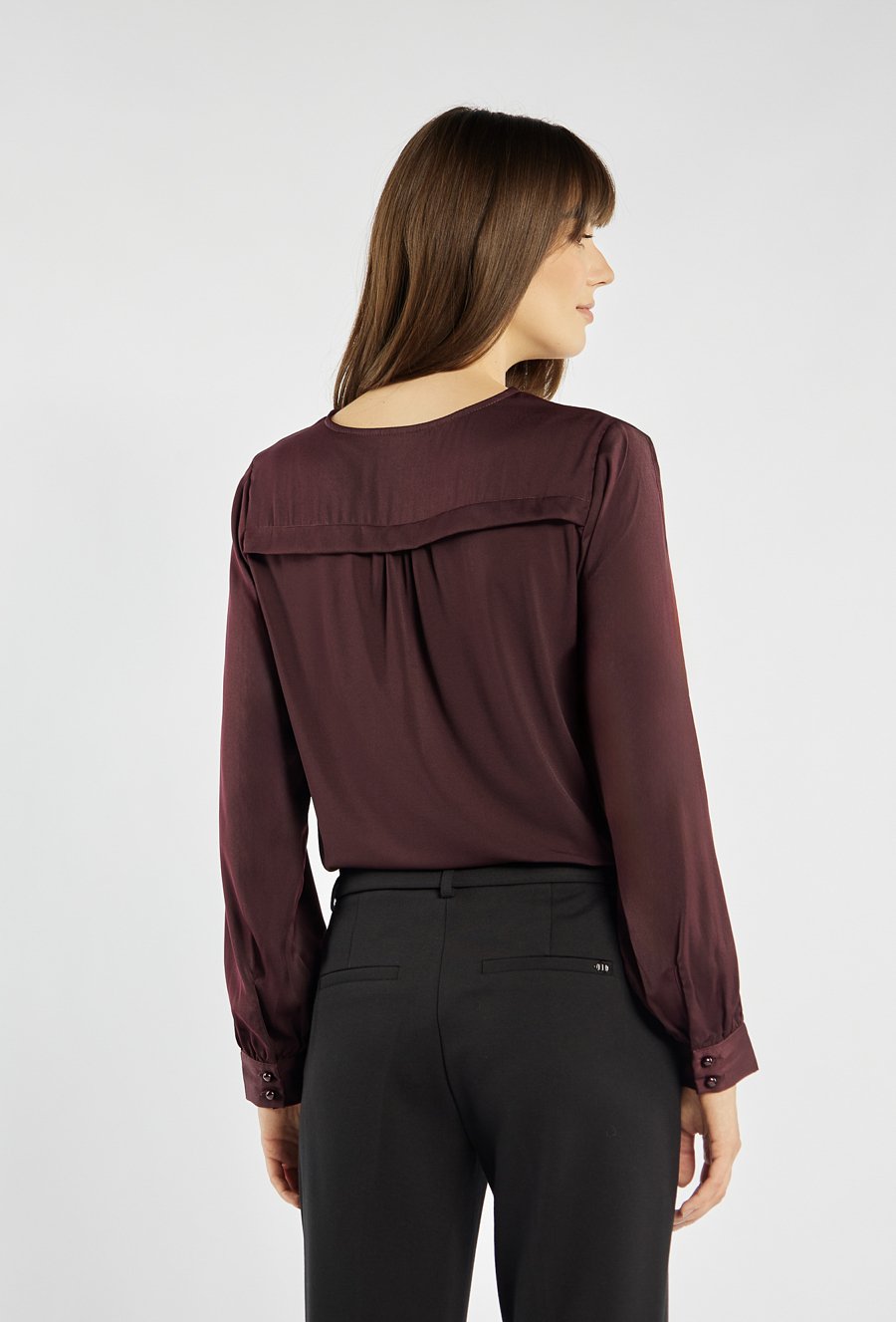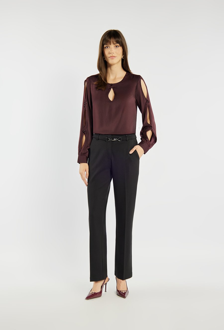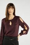 Elegancka bluzka damska o subtelnym, satynowym połysku. Jej wyjątkowym elementem są efektowne rozcięcia na rękawach. Bluzka z ozdobnym wycięciem przy dekolcie. Idealna na wyjątkowe okazje – święta, rodzinne spotkania czy wieczorne wyjścia. Modelka na zdjęciu ma 177 cm wzrostu i prezentuje rozmiar S.