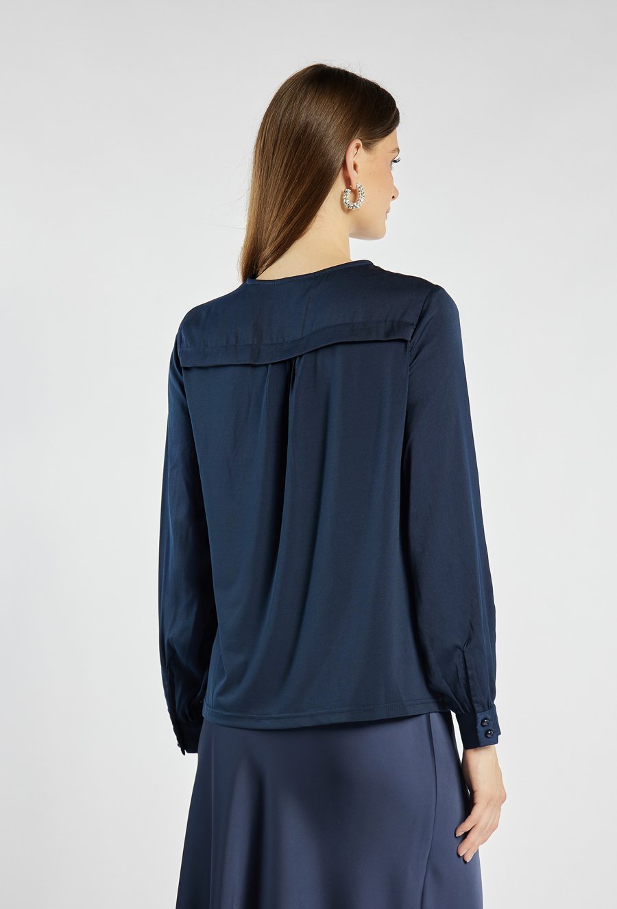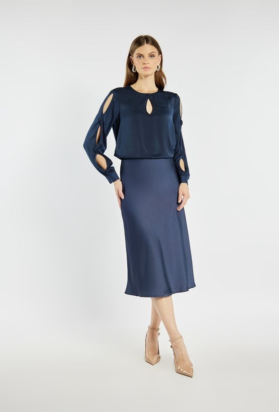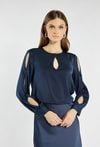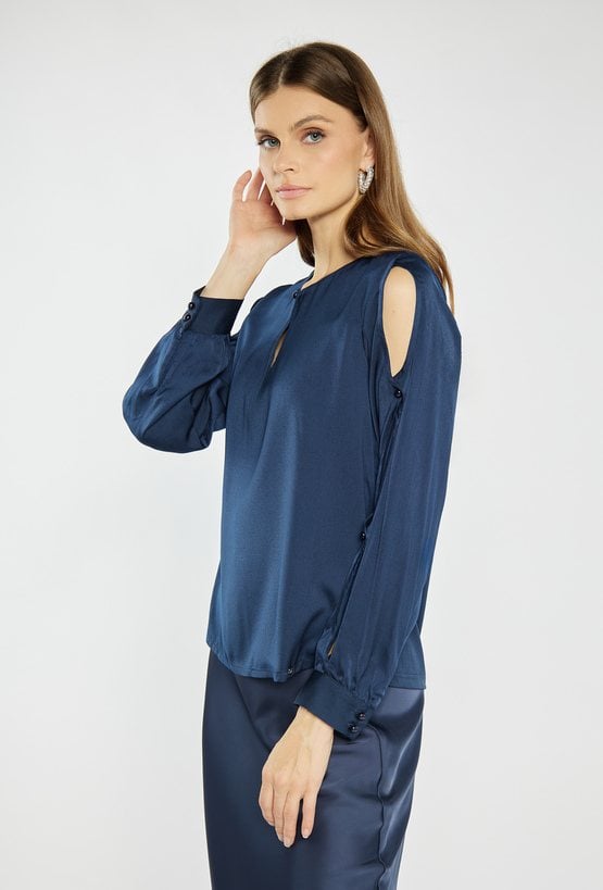 Elegancka bluzka damska o subtelnym, satynowym połysku. Jej wyjątkowym elementem są efektowne rozcięcia na rękawach. Bluzka z ozdobnym wycięciem przy dekolcie. Idealna na wyjątkowe okazje – święta, rodzinne spotkania czy wieczorne wyjścia. Modelka na zdjęciu ma 177 cm wzrostu i prezentuje rozmiar S.