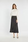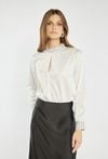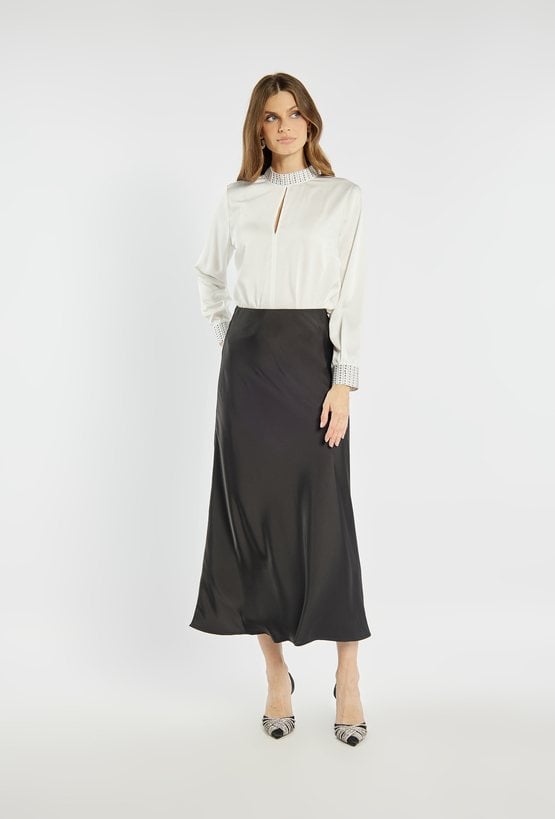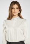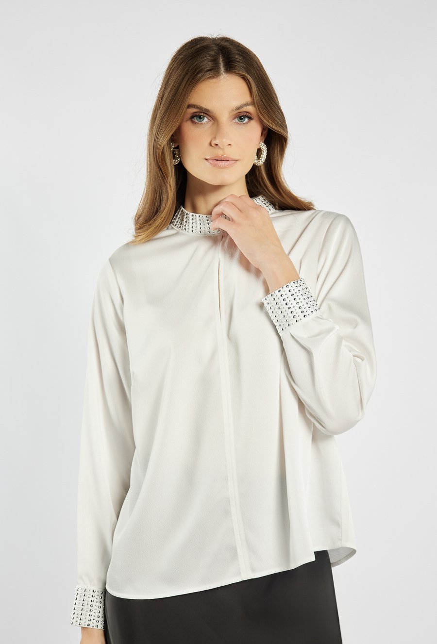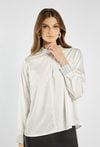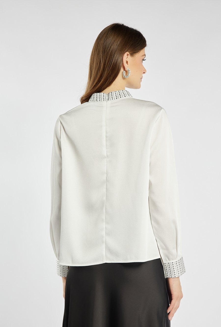 Elegancka bluzka zapinana z tyłu na kryty suwak. Wykończona efektownym kołnierzykiem oraz mankietami ozdobionymi połyskującymi cyrkoniami, które dodają całości wyjątkowego blasku. Bluzka doskonale sprawdzi się na wyjątkowe okazje – święta, przyjęcia czy wieczorne wyjścia. Modelka na zdjęciu ma 177 cm wzrostu i prezentuje rozmiar 36.