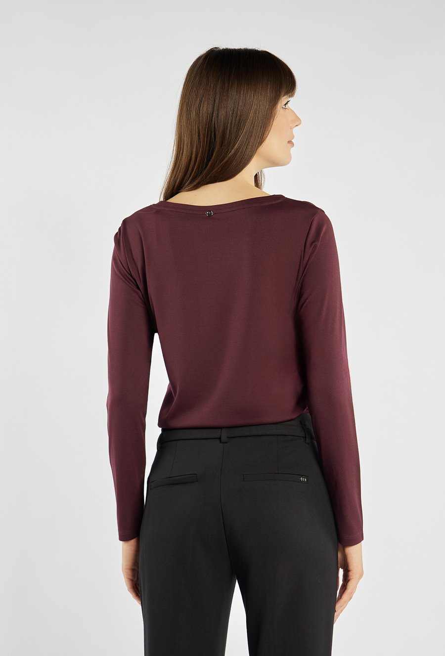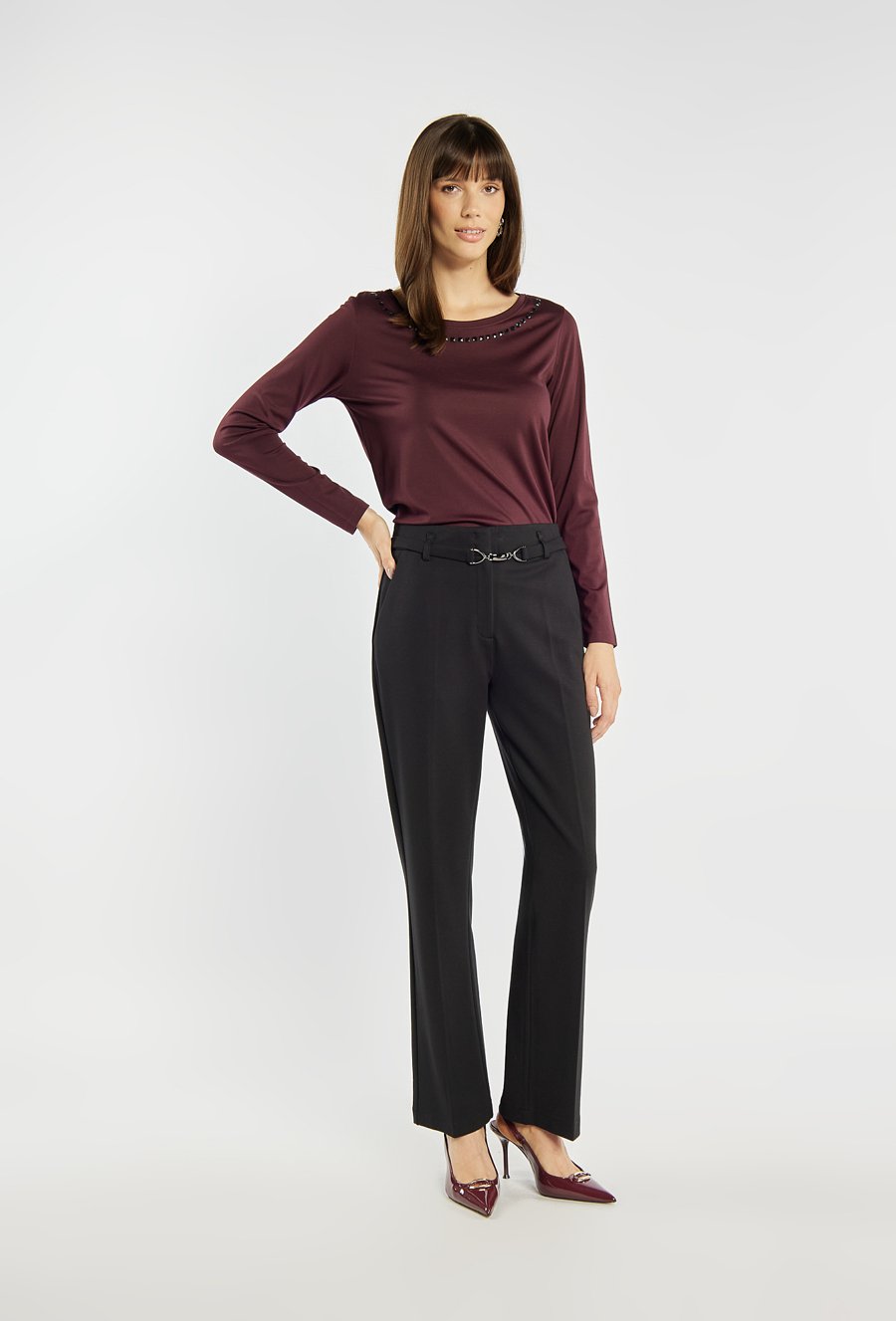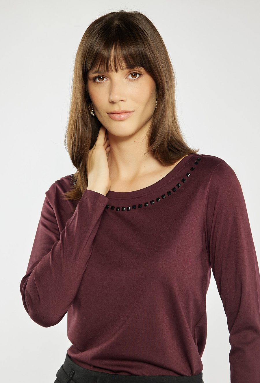 Bluzka z długim rękawem o klasycznym, prostym kroju, wzbogacona subtelną aplikacją przy dekolcie, która dodaje jej eleganckiego wykończenia. Model ten świetnie sprawdza się w codziennych i bardziej wyjściowych stylizacjach. Modelka na zdjęciu ma 177 cm wzrostu i prezentuje rozmiar S.