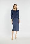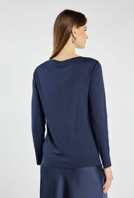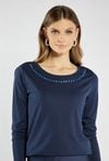 Bluzka z długim rękawem o klasycznym, prostym kroju, wzbogacona subtelną aplikacją przy dekolcie, która dodaje jej eleganckiego wykończenia. Model ten świetnie sprawdza się w codziennych i bardziej wyjściowych stylizacjach. Modelka na zdjęciu ma 177 cm wzrostu i prezentuje rozmiar S.