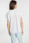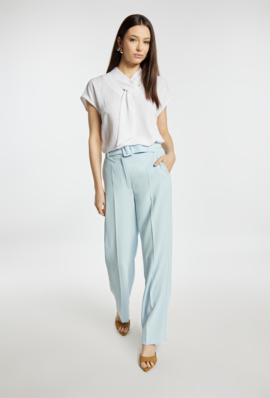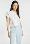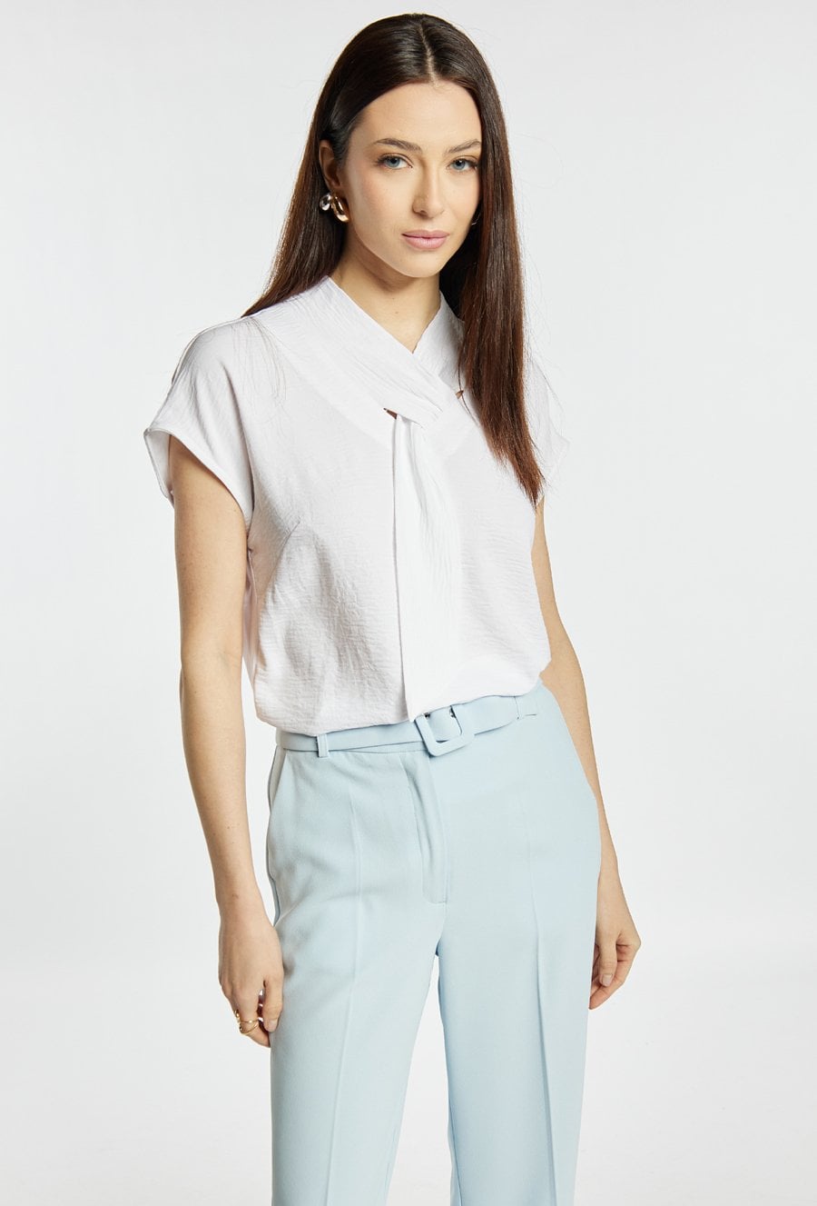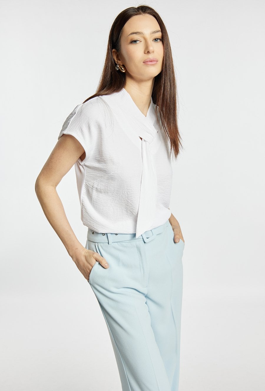 Bluzka damska o eleganckim, kobiecym kroju. Model z krótkim rękawem oraz efektownym wiązaniem przy dekolcie, które nadaje całości subtelnego, szykownego charakteru. Doskonale sprawdzi się zarówno w stylizacjach biurowych z materiałowymi spodniami lub spódnicą, jak i w bardziej swobodnych zestawach na co dzień. Modelka na zdjęciu ma 177 cm wzrostu i prezentuje rozmiar S.