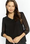Bluzka to idealna propozycja dla kobiet, które cenią sobie wygodę i komfort noszenia. Dekolt z dekoracyjną aplikacją, tworzy niezwykle kobiecy i zmysłowy look. Rękaw lekko transparentny doda całości elegancji i lekkości. Modelka prezentuje rozmiar S i mierzy 177 centymetrów wzrostu.