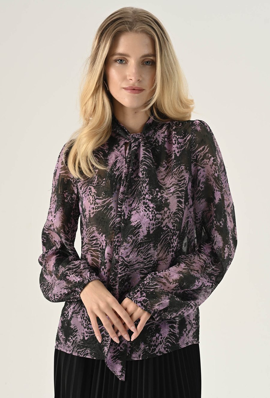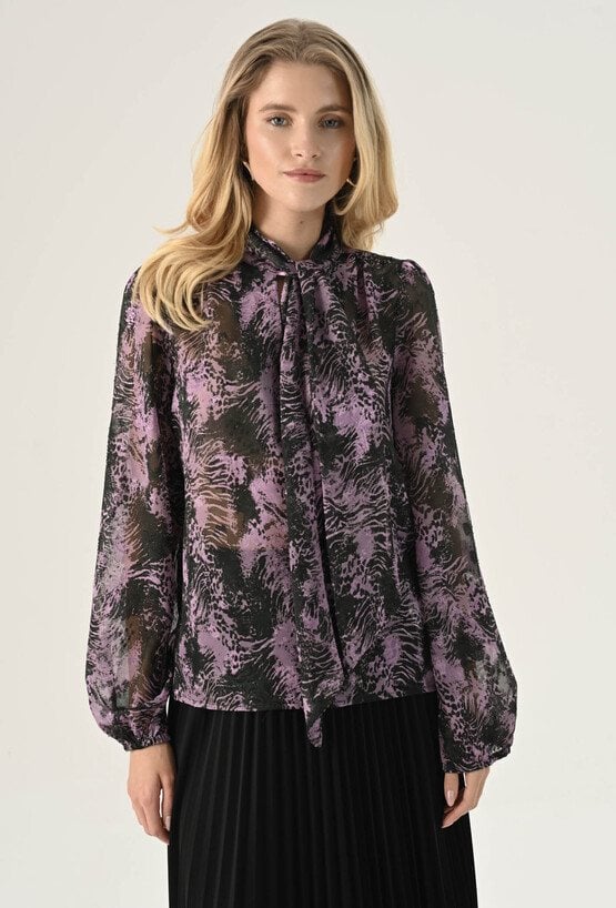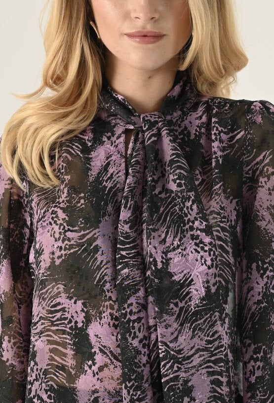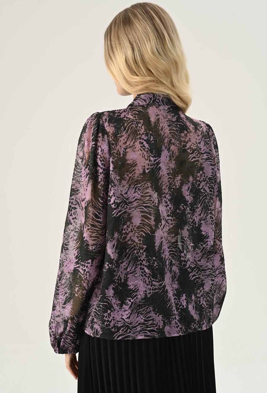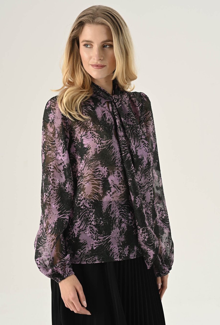 Elegancka bluzka damska z długim rękawem zakończonym delikatna bufką. Zabudowany dekolt ze stójką oraz ozdobna szarfa, która dodają jej kobiecego szyku. Wykonana z lekkiej i transparentnej tkaniny, jest wyjątkowo szykowną propozycją do eleganckich zestawów a wysoko kontrastowy wzór idealnie dopełni każdą stylizację. Modelka na zdjęciu ma 177 cm wzrostu i prezentuje rozmiar 36.