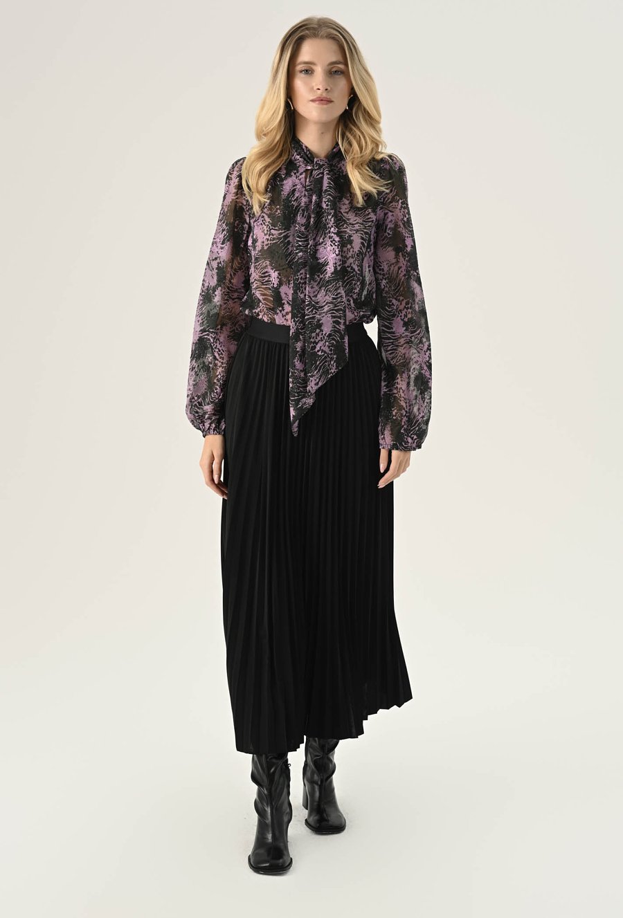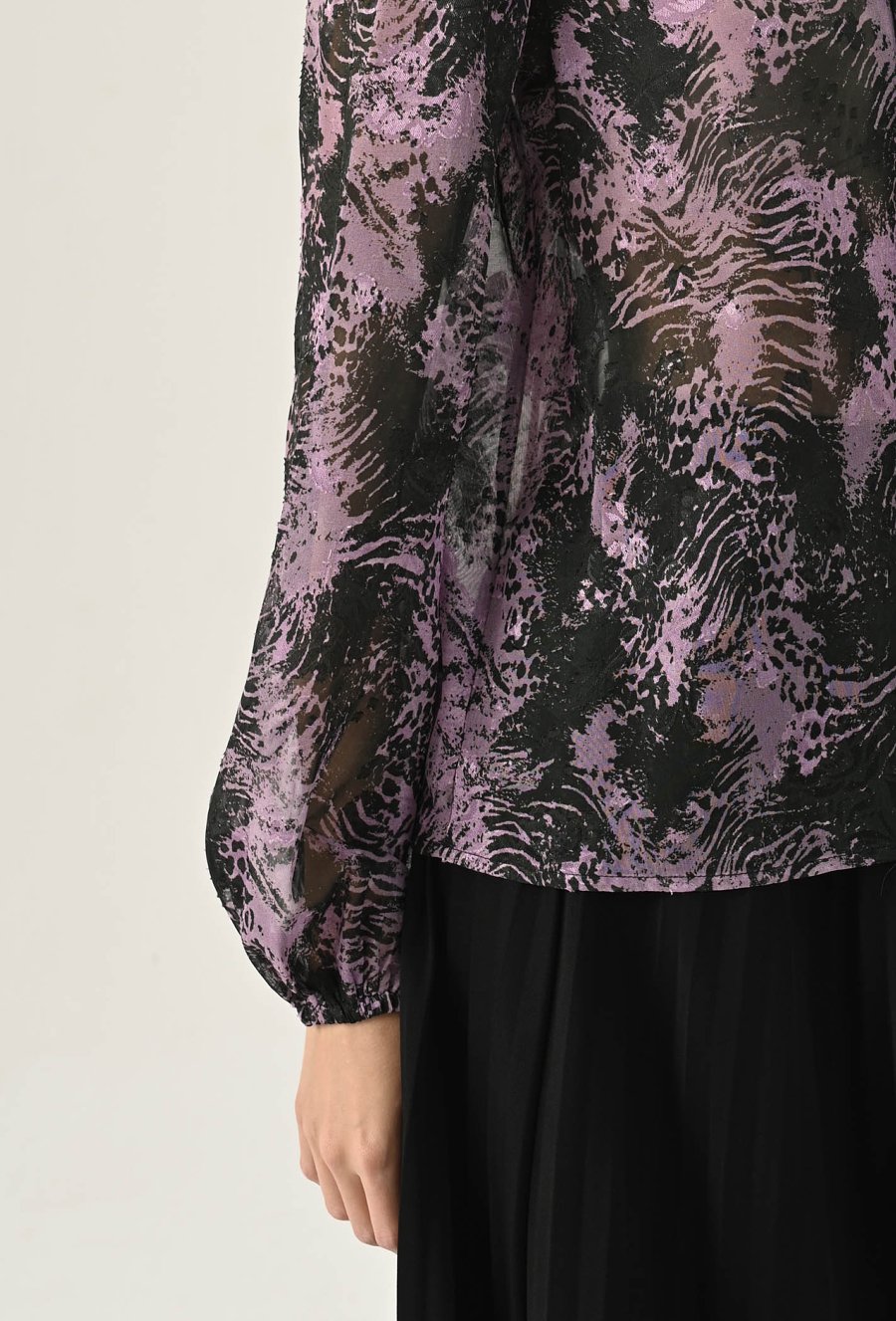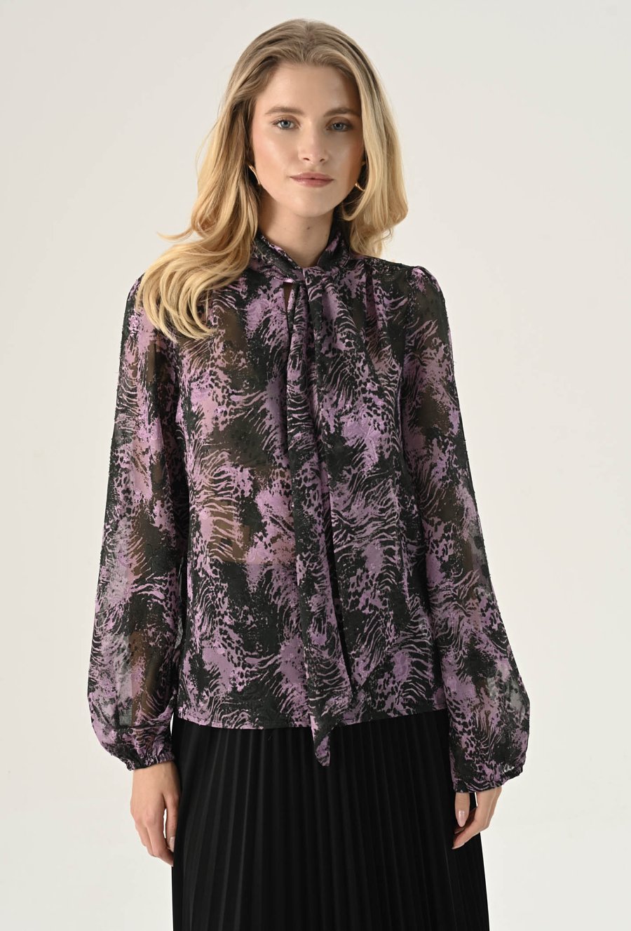 Elegancka bluzka damska z długim rękawem zakończonym delikatna bufką. Zabudowany dekolt ze stójką oraz ozdobna szarfa, która dodają jej kobiecego szyku. Wykonana z lekkiej i transparentnej tkaniny, jest wyjątkowo szykowną propozycją do eleganckich zestawów a wysoko kontrastowy wzór idealnie dopełni każdą stylizację. Modelka na zdjęciu ma 177 cm wzrostu i prezentuje rozmiar 36.