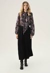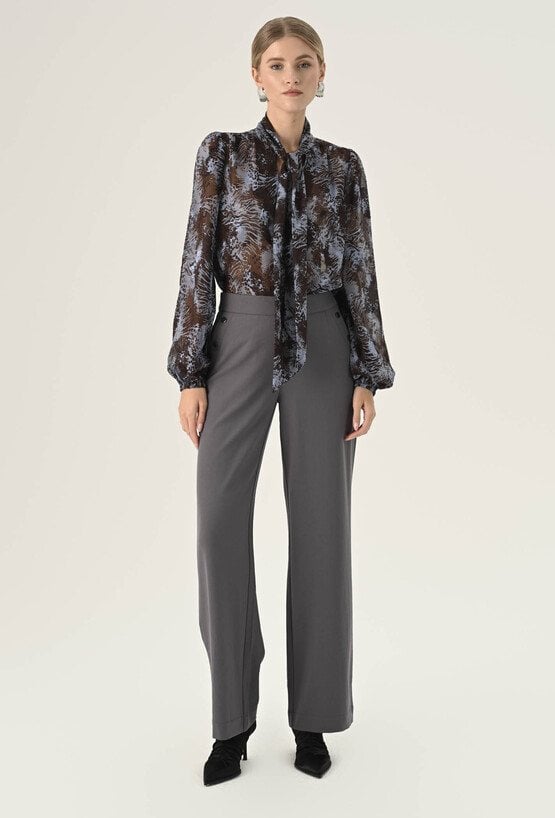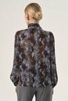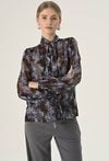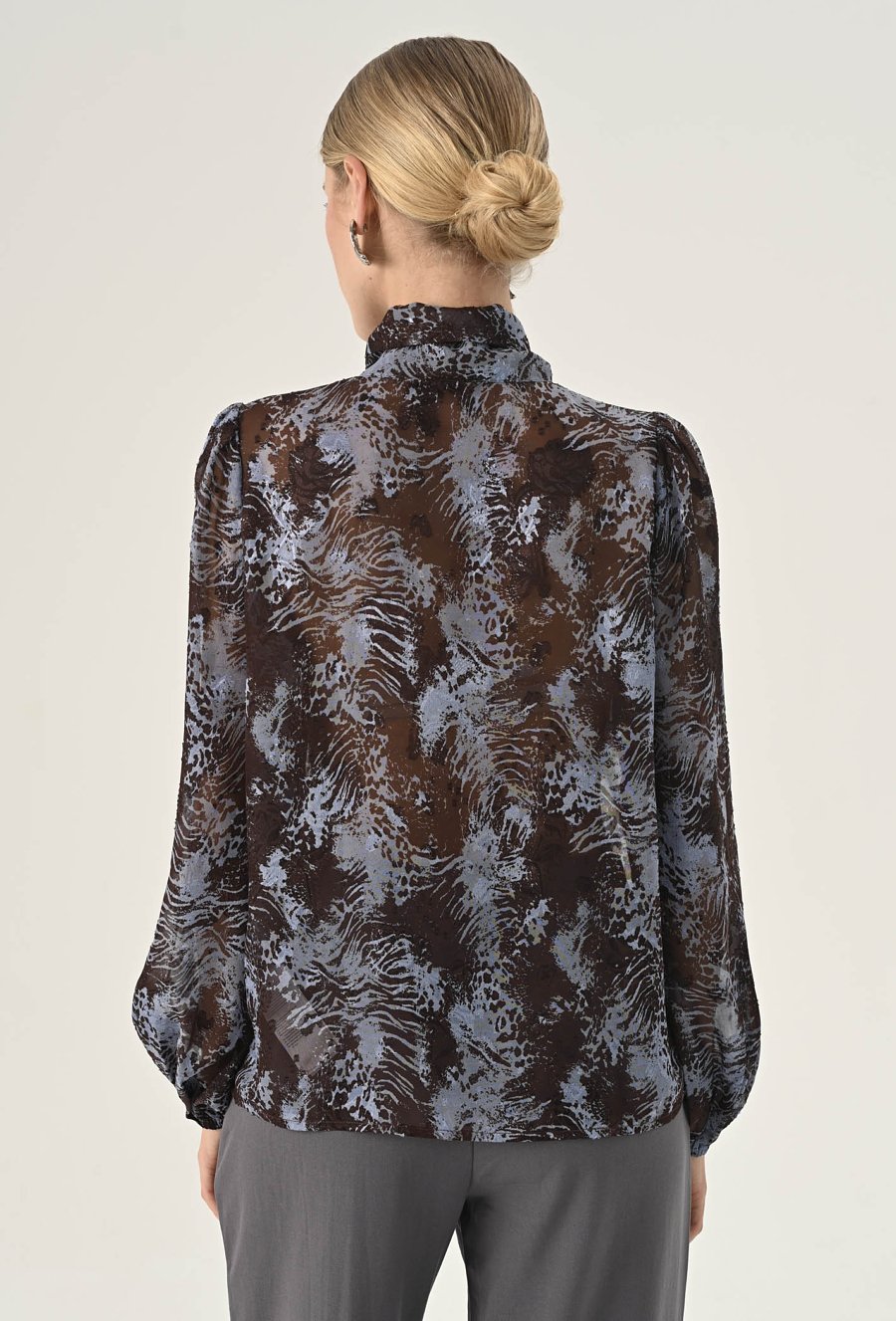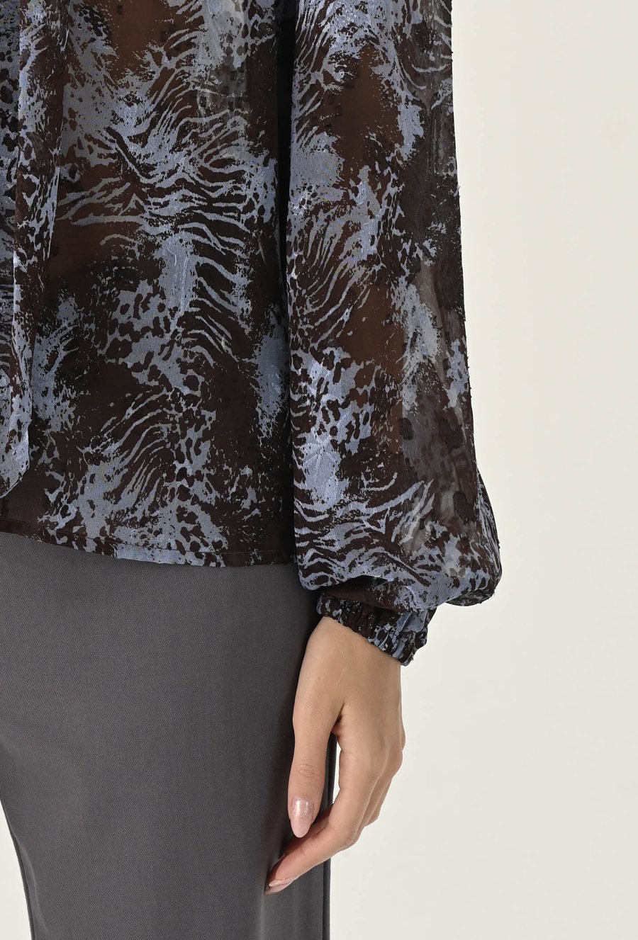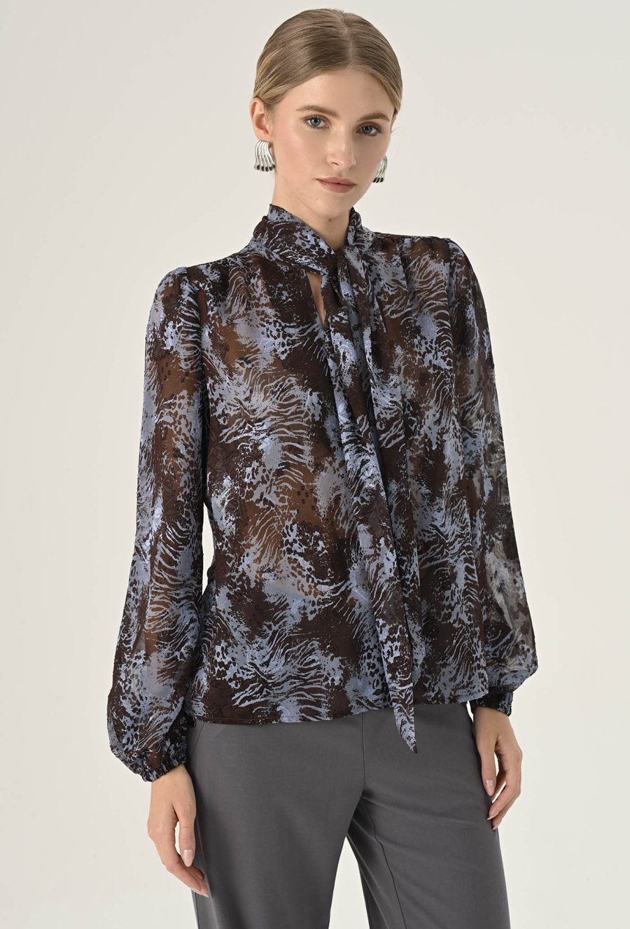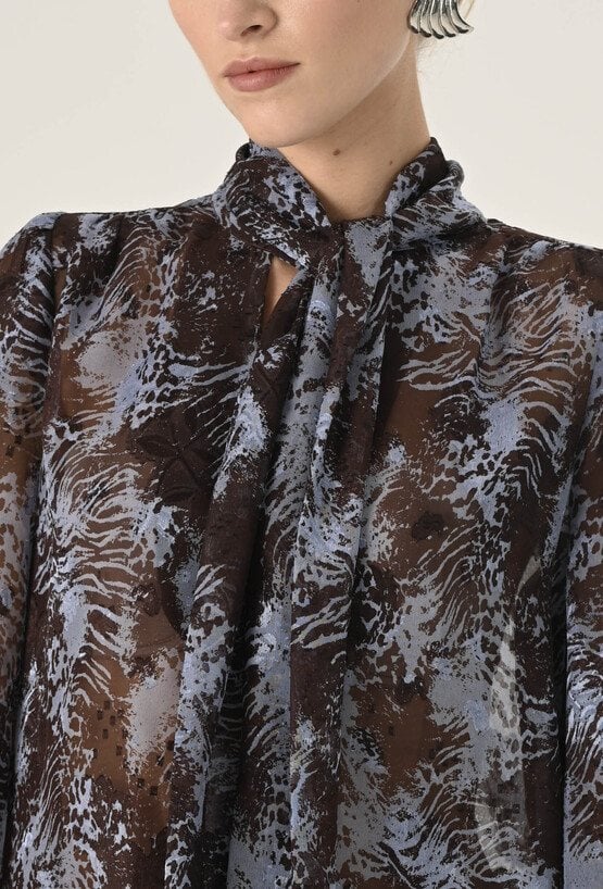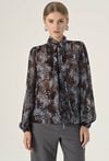 Elegancka bluzka damska z długim rękawem zakończonym delikatna bufką. Zabudowany dekolt ze stójką oraz ozdobna szarfa, która dodają jej kobiecego szyku. Wykonana z lekkiej i transparentnej tkaniny, jest wyjątkowo szykowną propozycją do eleganckich zestawów a wysoko kontrastowy wzór idealnie dopełni każdą stylizację. Modelka na zdjęciu ma 177 cm wzrostu i prezentuje rozmiar 36.