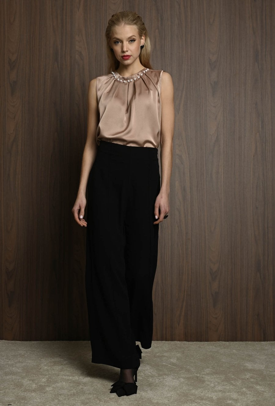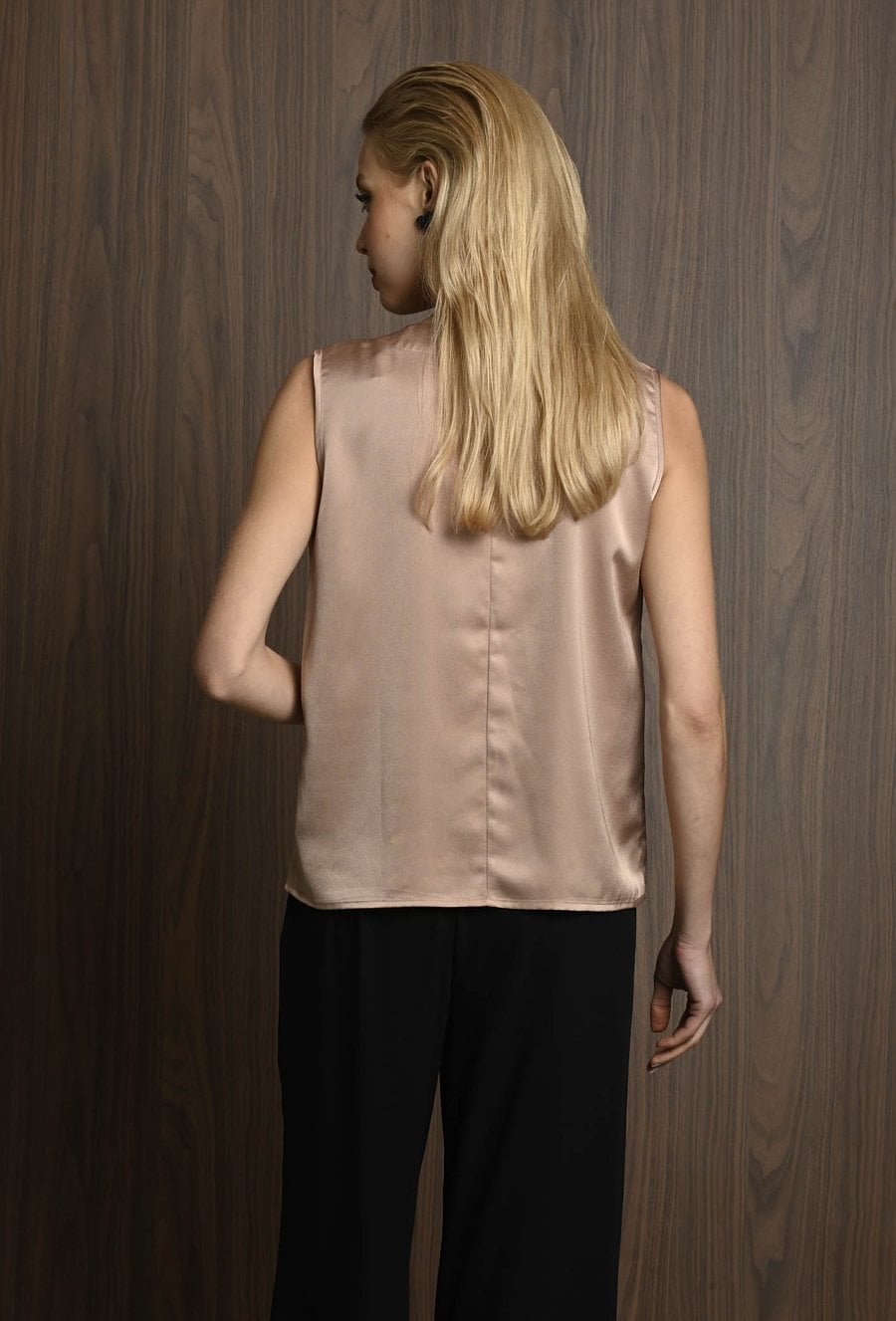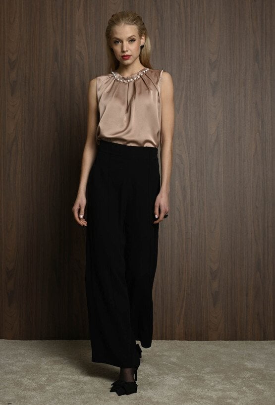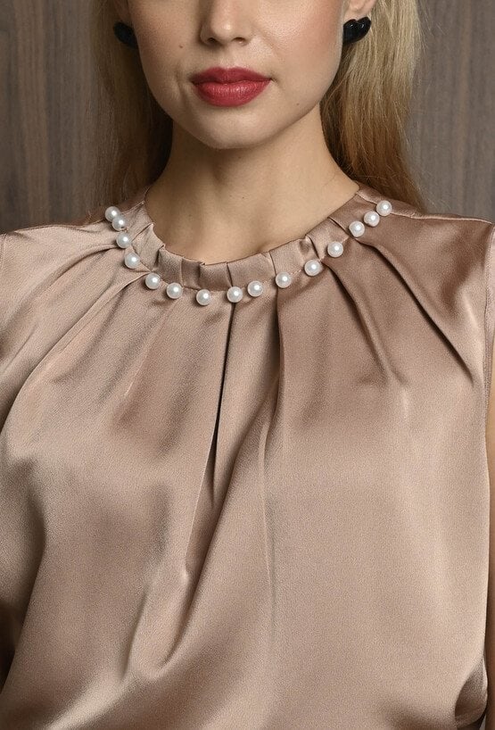 Gładka elegancka bluzka w pięknym, beżowym kolorze. Wykonana z miękkiego, przyjemnego w dotyku materiału o gładkiej strukturze. Szlachetny kolor dodaje jej elegancji i ponadczasowego charakteru, pozwalając na tworzenie wielu stylowych zestawień kolorystycznych. Minimalistyczny, prosty krój, który doskonale układa się na sylwetce. Subtelna stójka z ozdobnymi koralami przy dekolcie dodaje całości wyrafinowanego charakteru i wprowadza elegancki akcent. Lekka konstrukcja bez rękawów sprawia, że bluzka jest idealna zarówno solo, jak i w zestawieniu z marynarką czy żakietem. Doskonale sprawdzi się w stylizacjach biurowych, koktajlowych i wieczorowych. Modelka na zdjęciu ma 177 cm wzrostu i nosi rozmiar 36.
