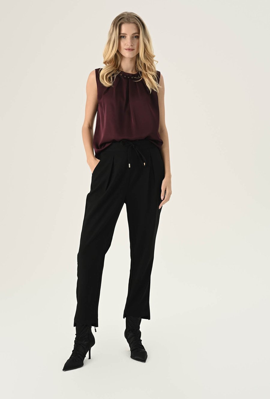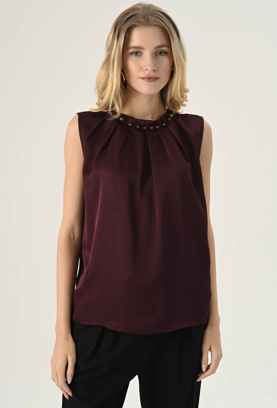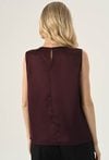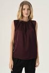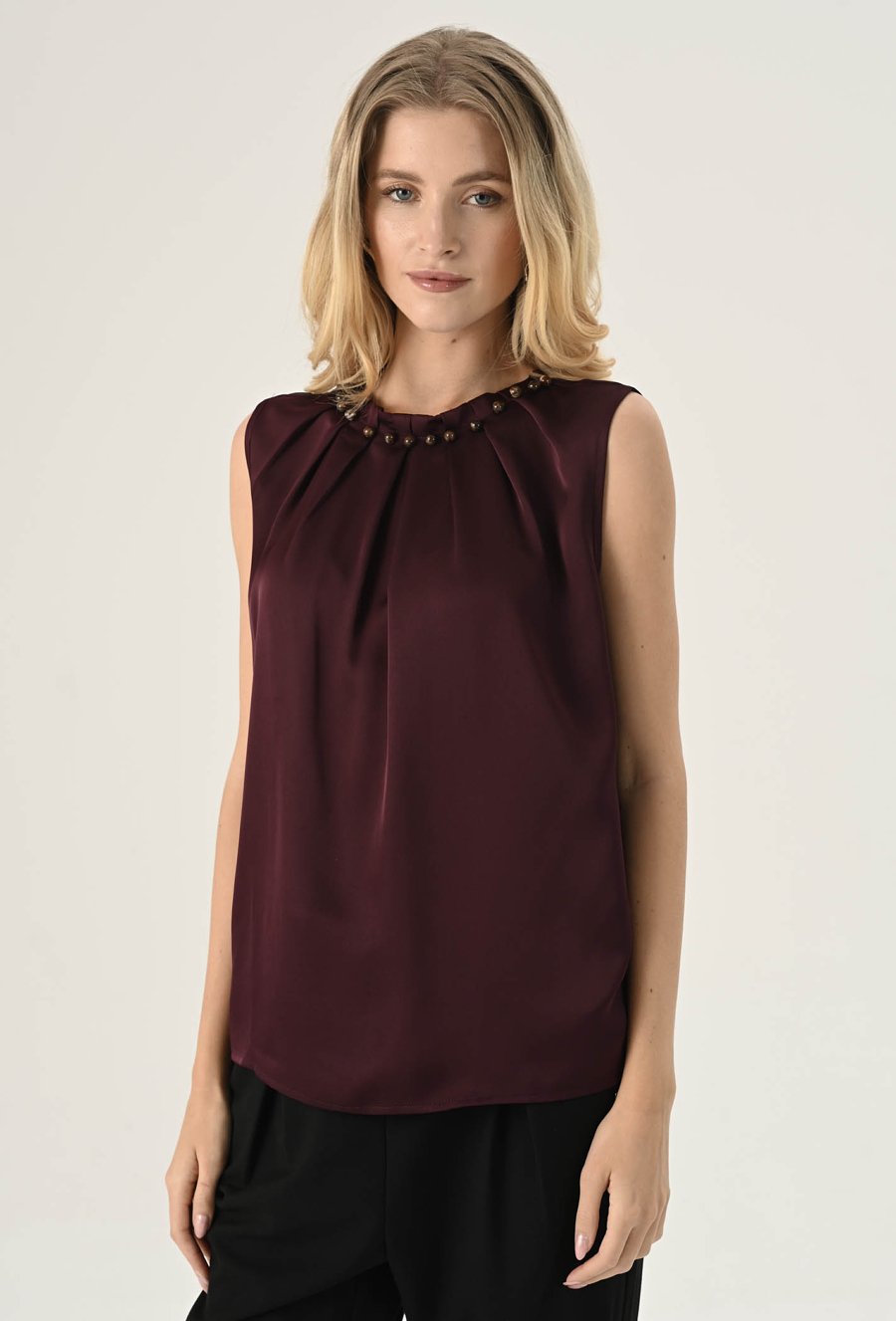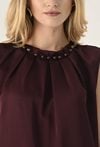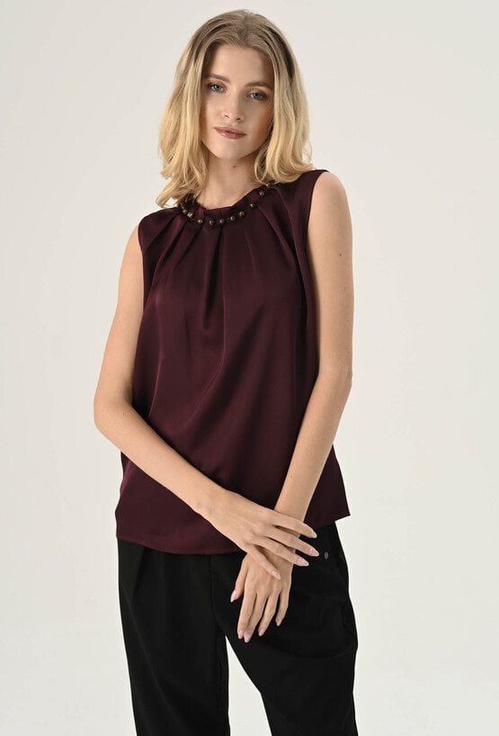 Gładka elegancka bluzka w pięknym kolorze cherry. Wykonana z miękkiego, przyjemnego w dotyku materiału o gładkiej strukturze. Szlachetny kolor dodaje jej elegancji i ponadczasowego charakteru, pozwalając na tworzenie wielu stylowych zestawień kolorystycznych. Minimalistyczny, prosty krój, który doskonale układa się na sylwetce. Subtelna stójka z ozdobnymi koralami przy dekolcie dodaje całości wyrafinowanego charakteru i wprowadza elegancki akcent. Lekka konstrukcja bez rękawów sprawia, że bluzka jest idealna zarówno solo, jak i w zestawieniu z marynarką czy żakietem. Doskonale sprawdzi się w stylizacjach biurowych, koktajlowych i wieczorowych. Modelka na zdjęciu ma 177 cm wzrostu i nosi rozmiar 36.