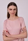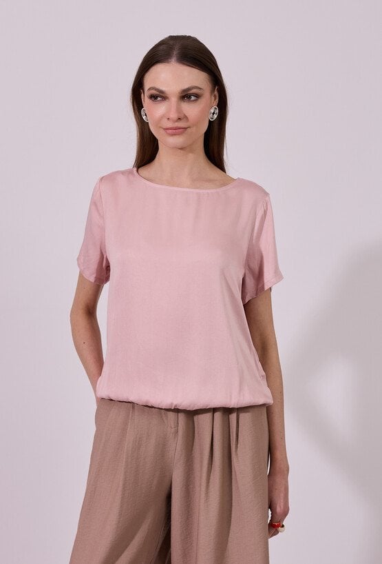 Bluzka damska o prostym, eleganckim kroju z krótkim rękawem. Model z klasycznym, okrągłym dekoltem, który nadaje całości minimalistycznego charakteru. Dół wykończony elastyczną gumką zapewnia dobre dopasowanie i subtelne marszczenie. Modelka na zdjęciu ma 177 cm wzrostu i prezentuje rozmiar 36.