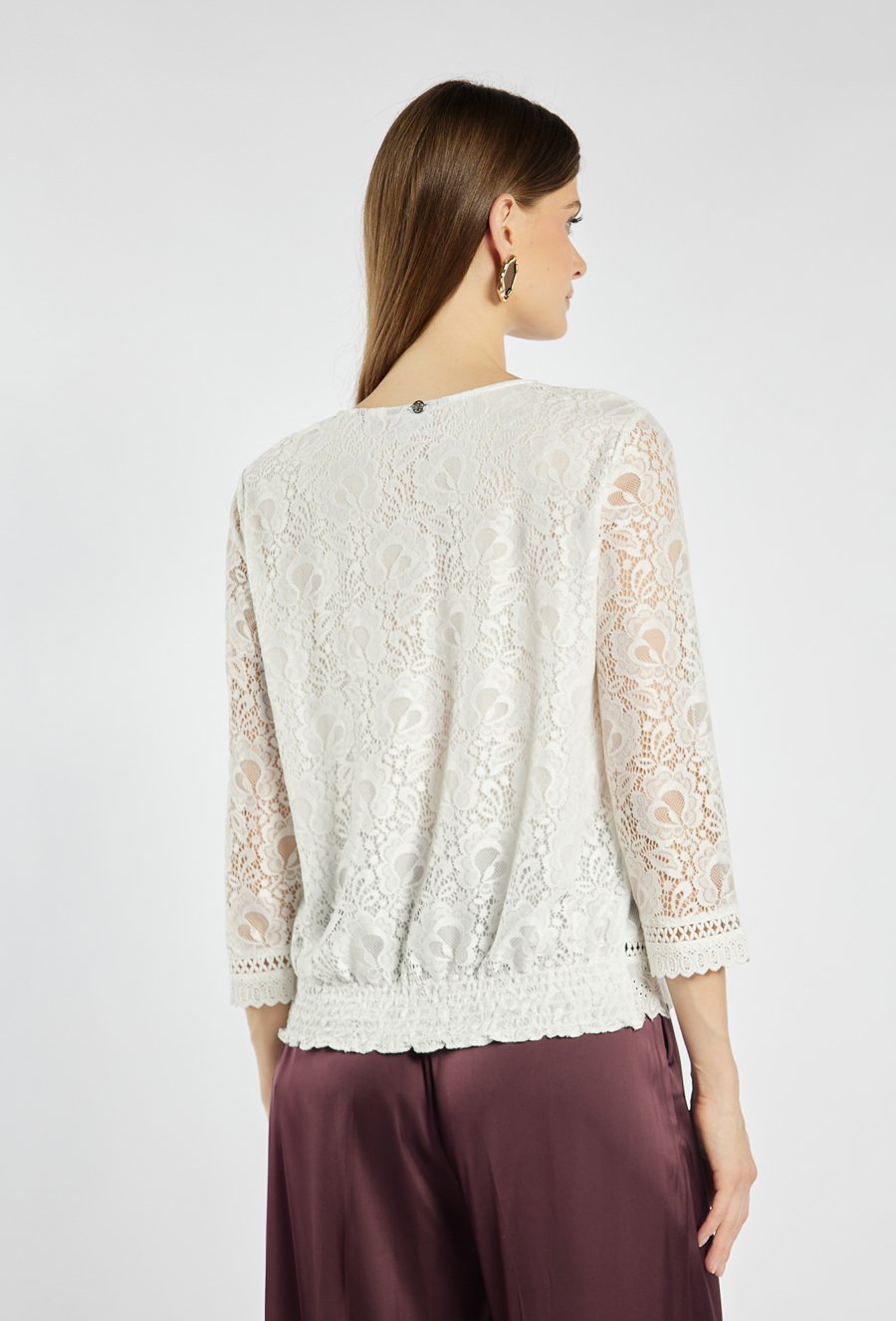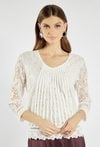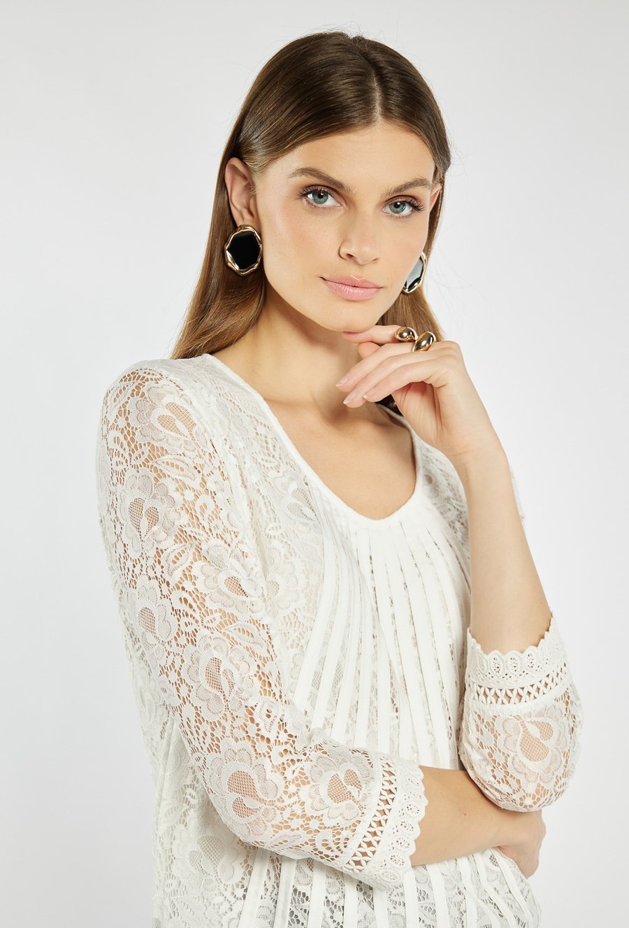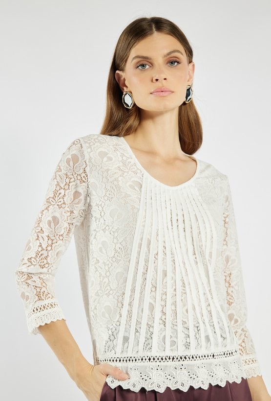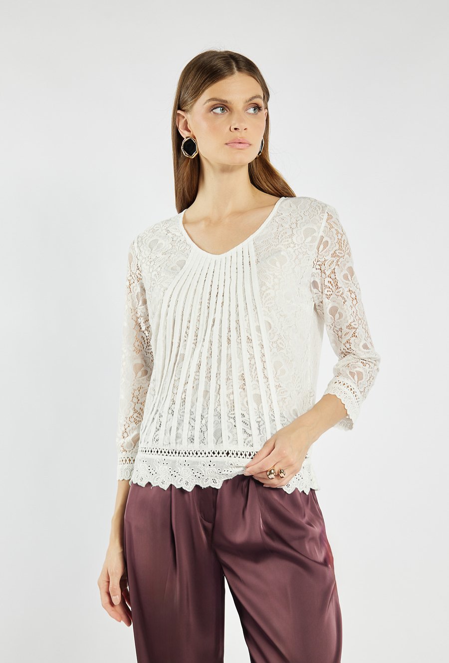 Koronkowa bluzka z dekoltem w kształcie litery V. Przód zdobią pionowe plisowania, które subtelnie wysmuklają sylwetkę. Bluzka wykończona ozdobną koronką przy dolnej krawędzi i rękawach o długości 3/4. Delikatna i kobieca, idealna do eleganckich stylizacji. Modelka na zdjęciu ma 177 cm wzrostu i prezentuje rozmiar 36.