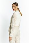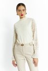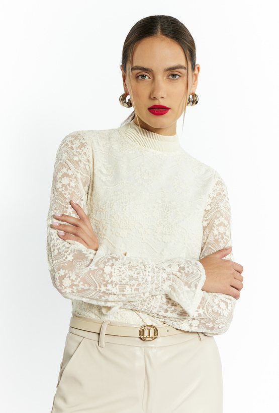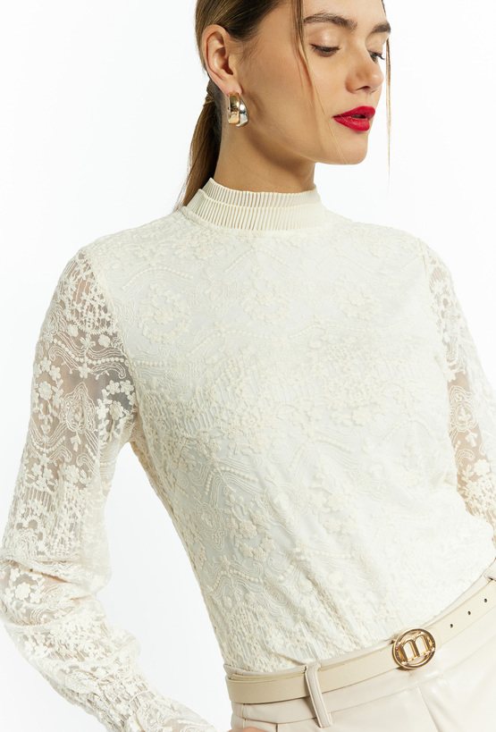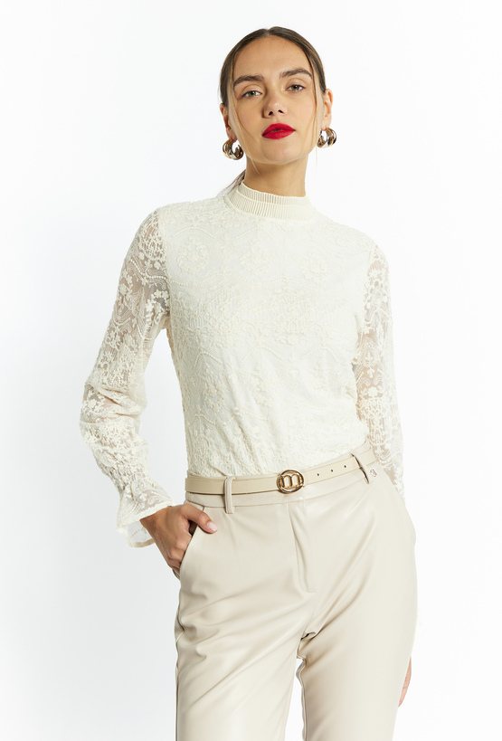 Ta bluzka damska to doskonały wybór dla kobiet ceniących sobie elegancję. Została wykonana z delikatnej bawełny i ozdobiona koronką, dzięki czemu jest bardzo subtelna i dziewczęca. Model z długimi rękawami i z dekoltem w formie niskiej stójki dodaje jej klasycznego charakteru. Falbanka przy mankietach oraz zapięcie z tyłu na guzik dopełniają całości. Ta bluzka to doskonały wybór na wiele okazji. Modelka prezentuje rozmiar S i mierzy 177 centymetrów wzrostu.