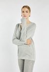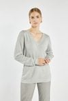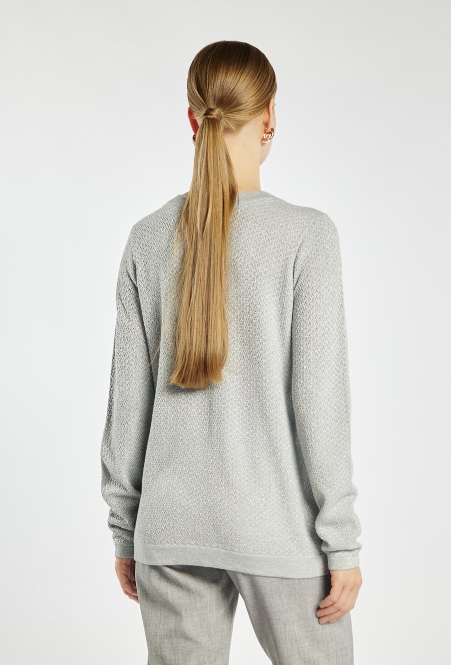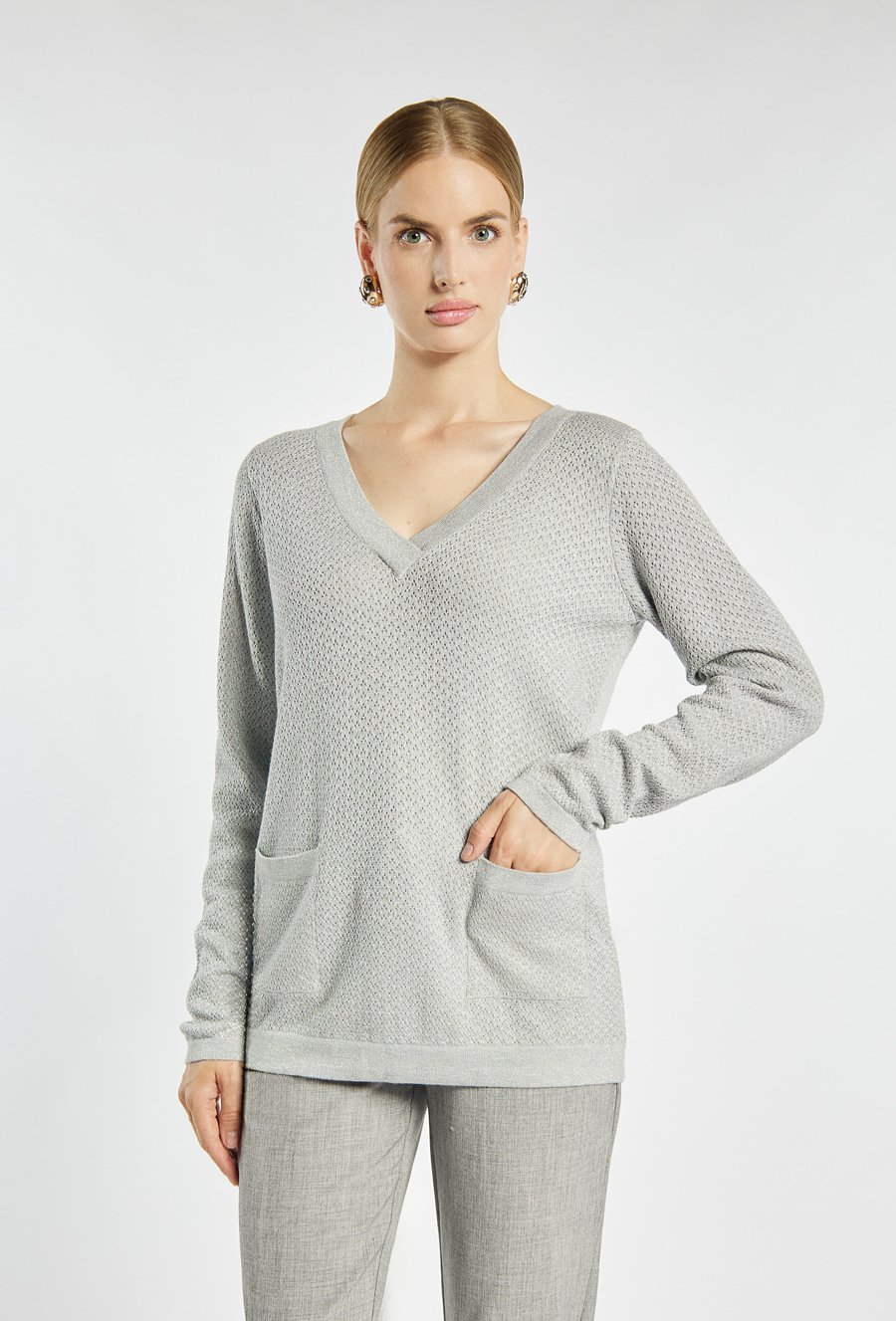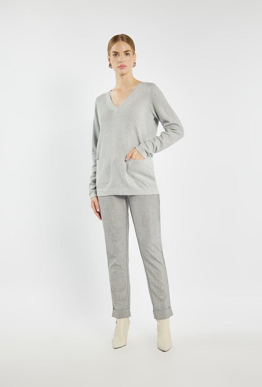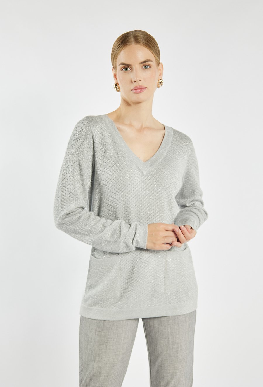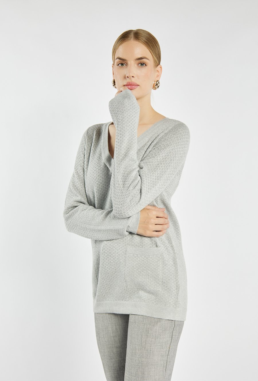 Stylowa bluzka damska z delikatnym, metalicznym połyskiem. Model o luźnym kroju z dekoltem w serek i dwiema małymi kieszonkami z przodu. Idealna zarówno do codziennych stylizacji, jak i bardziej eleganckich zestawień. Modelka na zdjęciu ma 177 cm wzrostu i prezentuje rozmiar S.