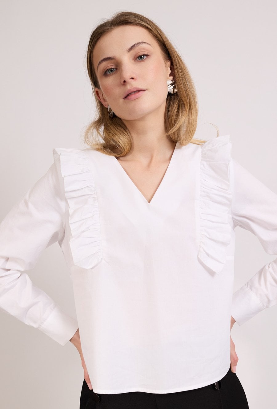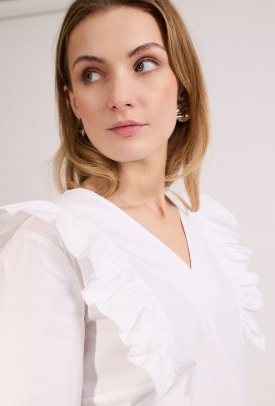 Stylowa bluzka damska o luźnym kroju z długim rękawem. Model z dekoltem w kształcie litery V oraz ozdobnymi falbanami, które nadają stylizacji kobiecego charakteru. Bluzka doskonale sprawdzi się w eleganckich i codziennych stylizacjach, do pracy oraz na spotkania. Modelka na zdjęciu ma 177 cm wzrostu i prezentuje rozmiar 36.