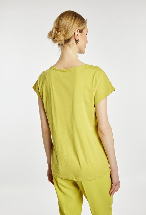T-shirt damski o luźnym kroju z krótkim rękawem. Model z okrągłym dekoltem oraz ozdobnym detalem przy ramieniu, który nadaje całości eleganckiego i oryginalnego charakteru. Doskonale sprawdzi się w codziennych i bardziej stylowych zestawieniach, zapewniając komfort noszenia. Modelka na zdjęciu ma 177 cm wzrostu i prezentuje rozmiar S.