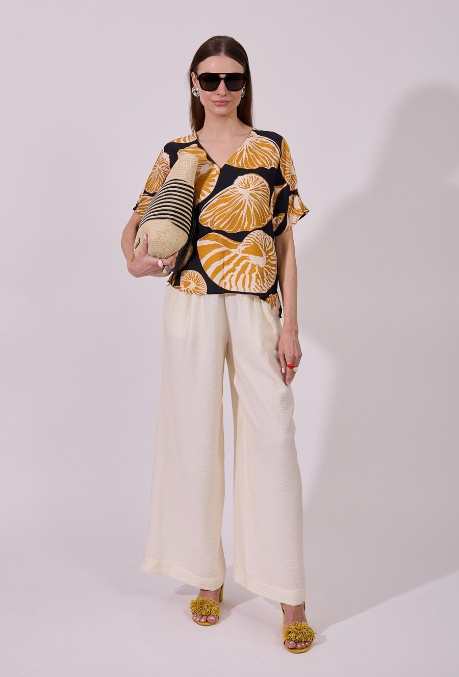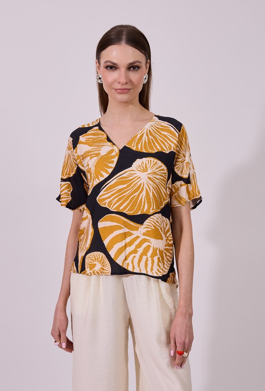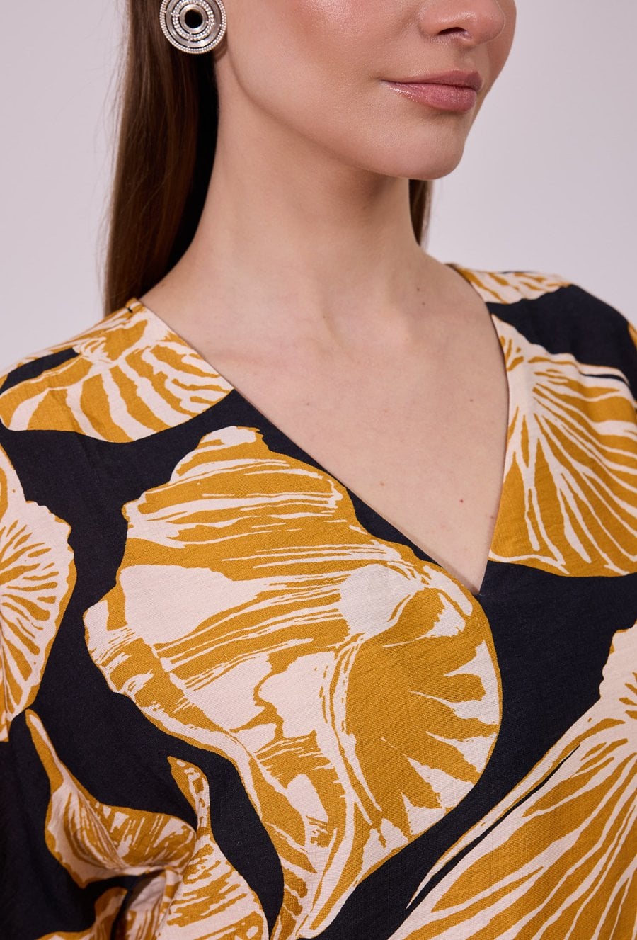 Bluzka damska o luźnym, komfortowym kroju z krótkim rękawem. Model z dekoltem w kształcie litery V, który subtelnie podkreśla linię szyi. Całość zdobi wyrazisty, roślinny wzór, nadający stylizacji nowoczesnego i świeżego charakteru. Modelka na zdjęciu ma 177 cm wzrostu i prezentuje rozmiar S.