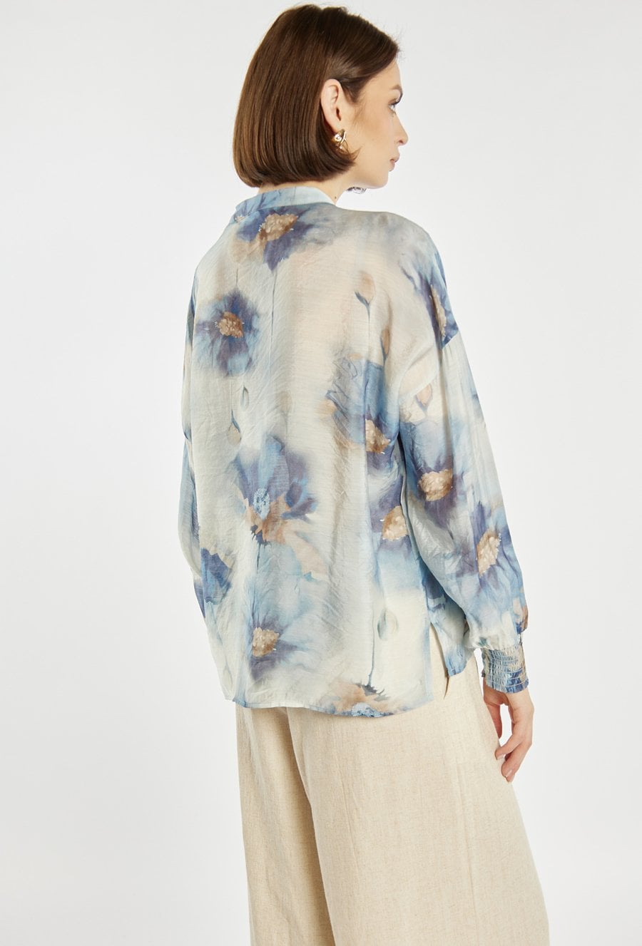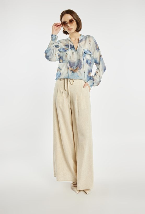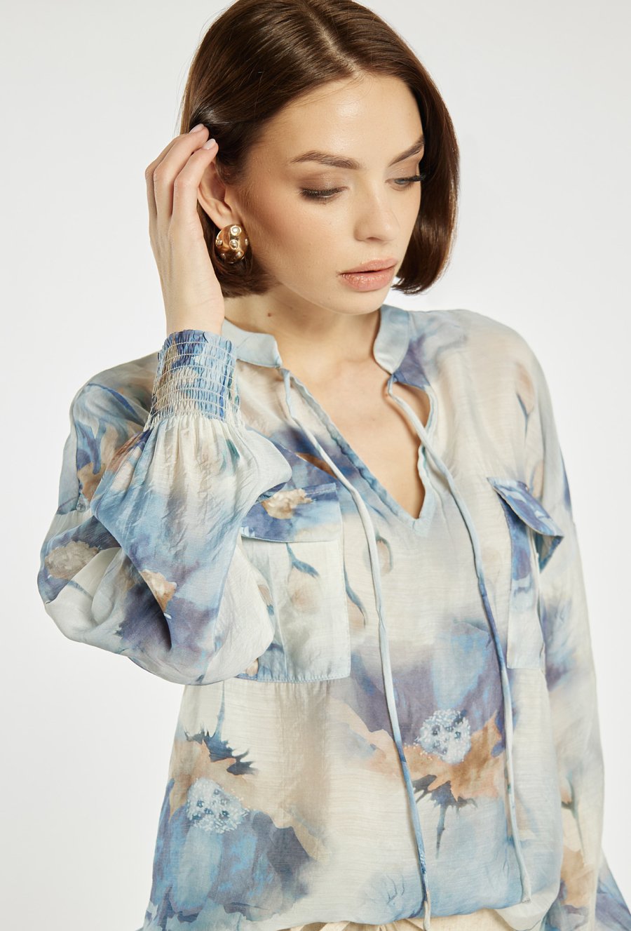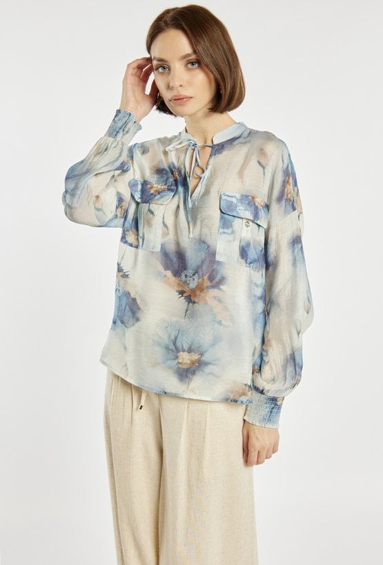 Bluzka damska o lekkim, zwiewnym kroju z efektownym, geometrycznym wzorem. Bluzka ma długie rękawy, kołnierzyk typu stójka oraz subtelne rozcięcie przy dekolcie, które dodaje jej elegancji. Bluzka sprawdzi się zarówno w codziennych stylizacjach, jak i w bardziej szykownych zestawach. Modelka na zdjęciu ma 177 cm wzrostu i prezentuje rozmiar 36.