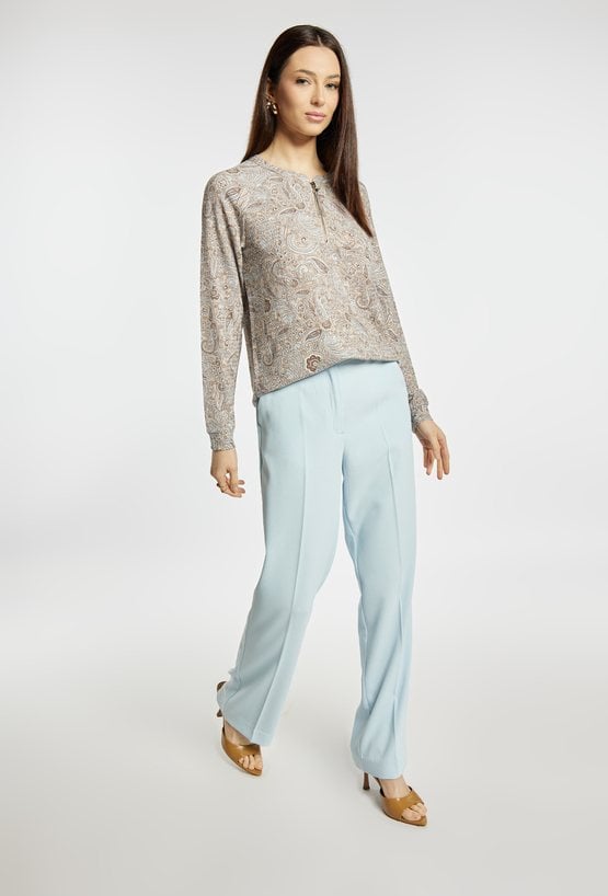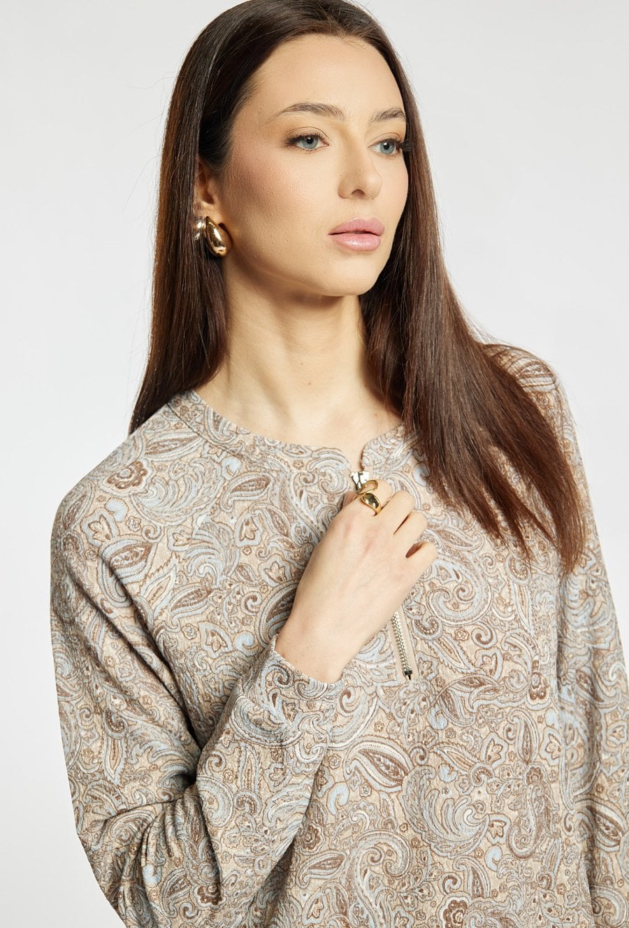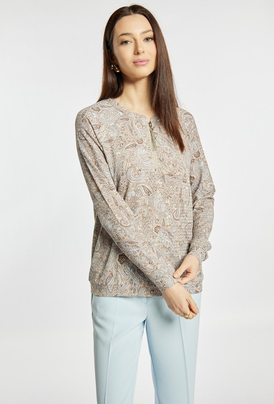 Bluzka damska o klasycznym, prostym kroju z efektownym wzorem paisley na całej powierzchni. Model z długim rękawem oraz dekoltem wykończonym krótkim zamkiem, który nadaje całości nowoczesnego charakteru. Bluzka świetnie sprawdzi się w codziennych stylizacjach. Modelka na zdjęciu ma 177 cm wzrostu i prezentuje rozmiar S.