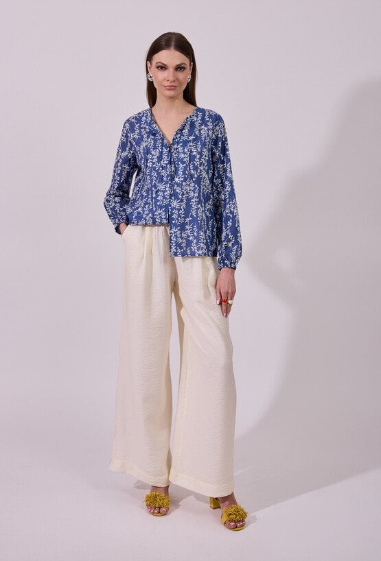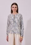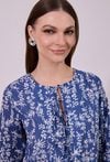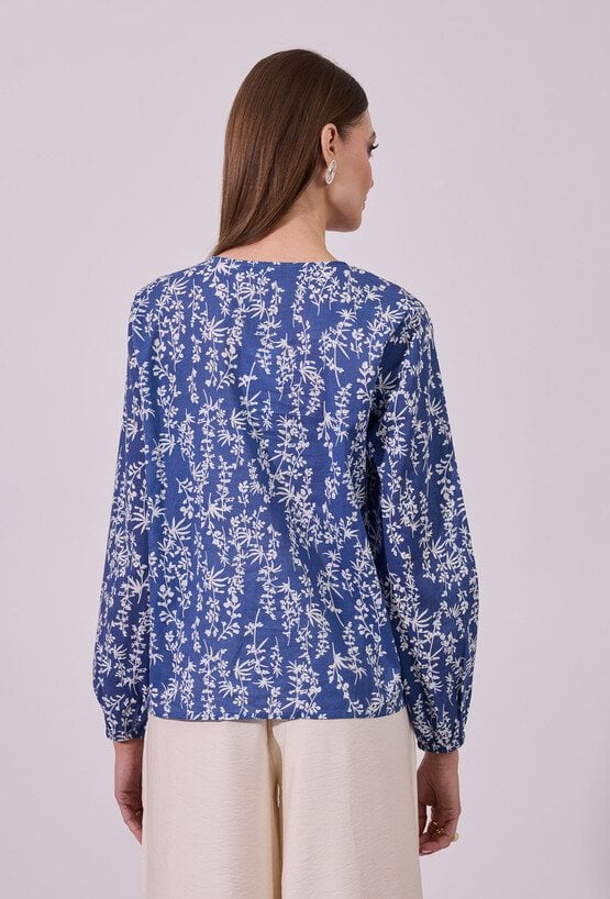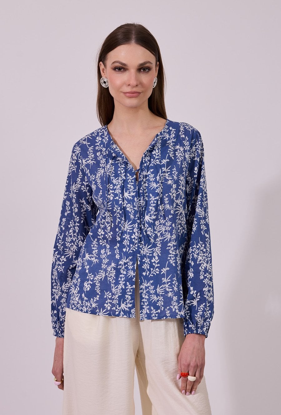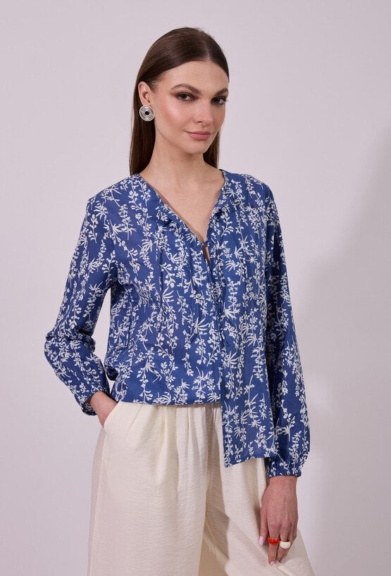Bluzka damska o luźnym, komfortowym kroju z długim rękawem. Model z dekoltem w kształcie litery V, wykończonym subtelnym wiązaniem, które dodaje całości lekkości i kobiecego charakteru. Całość zdobi delikatny, roślinny wzór, nadający stylizacji świeżości i naturalnego uroku. Idealna zarówno do codziennych, jak i bardziej eleganckich stylizacji. Modelka na zdjęciu ma 177 cm wzrostu i prezentuje rozmiar 36.