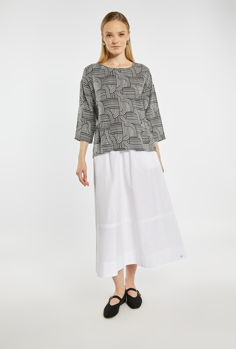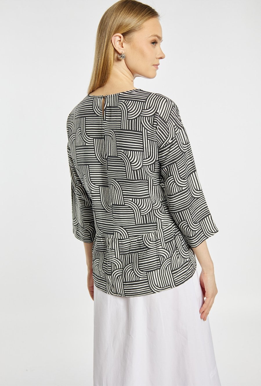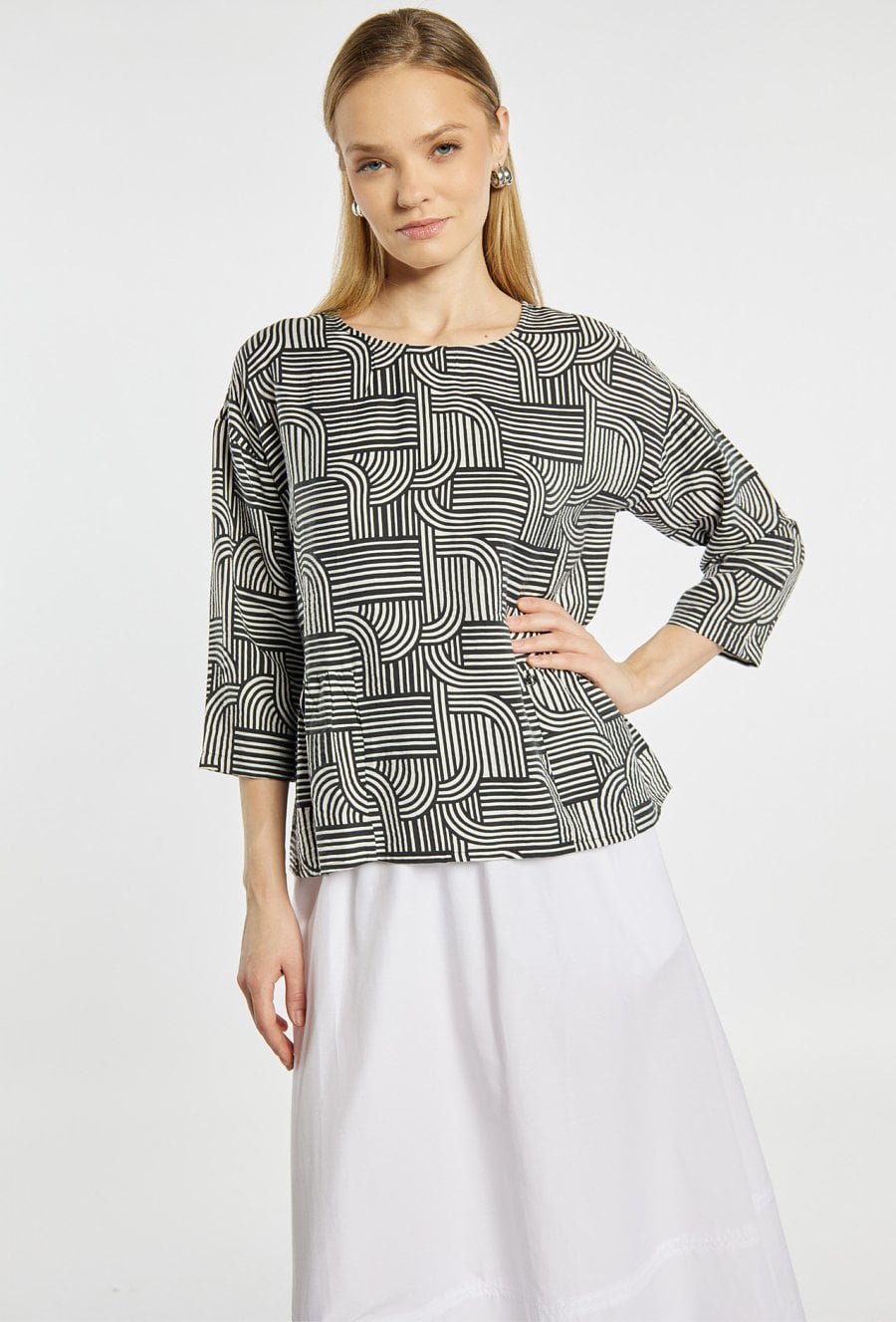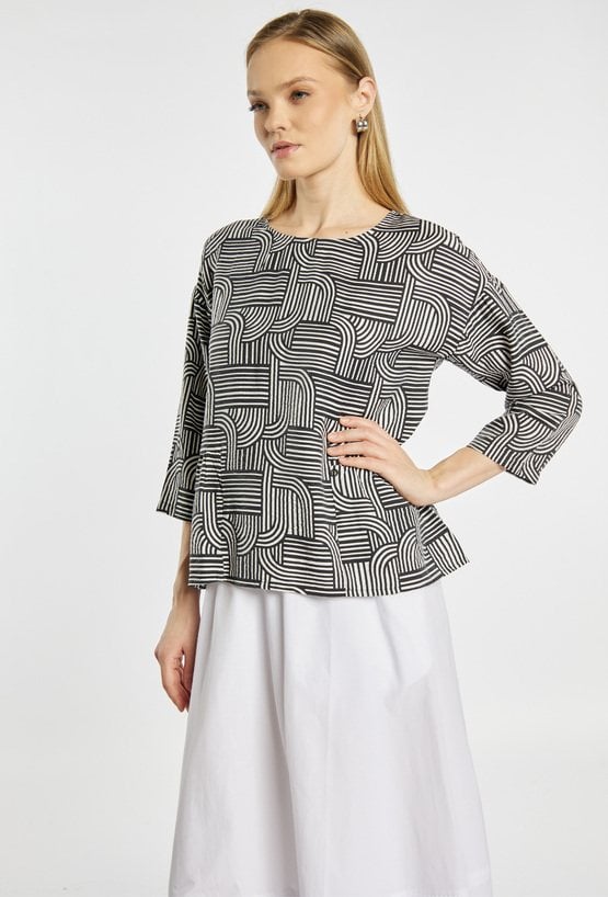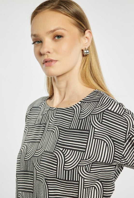 Bluzka damska o swobodnym fasonie, wykonana z lekkiego, przyjemnego w noszeniu materiału. Model z okrągłym dekoltem oraz rękawami o długości 3/4. Całość zdobi geometryczny wzór w kontrastowych kolorach, który nadaje bluzce nowoczesnego charakteru. Modelka na zdjęciu ma 177 cm wzrostu i prezentuje rozmiar 36.