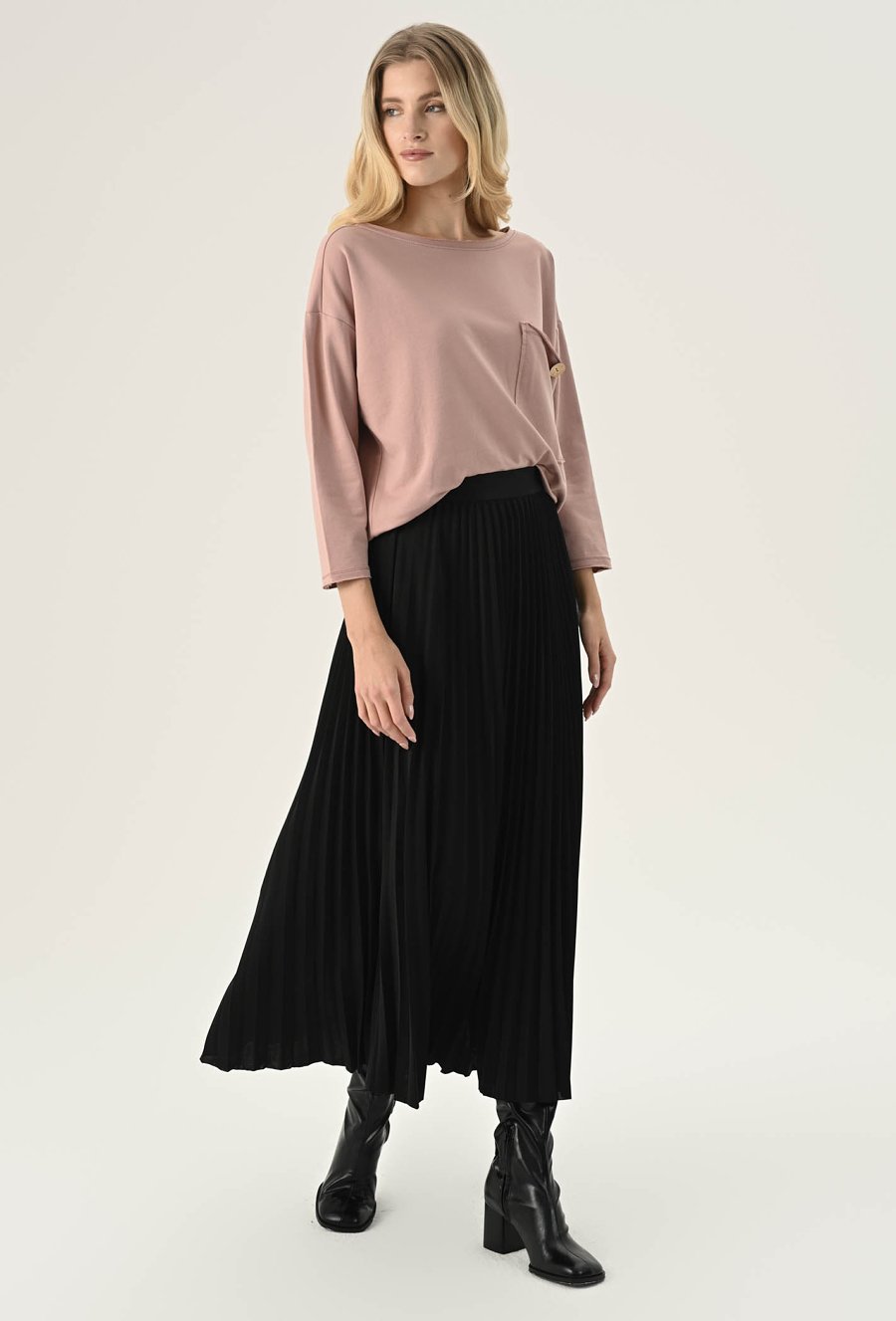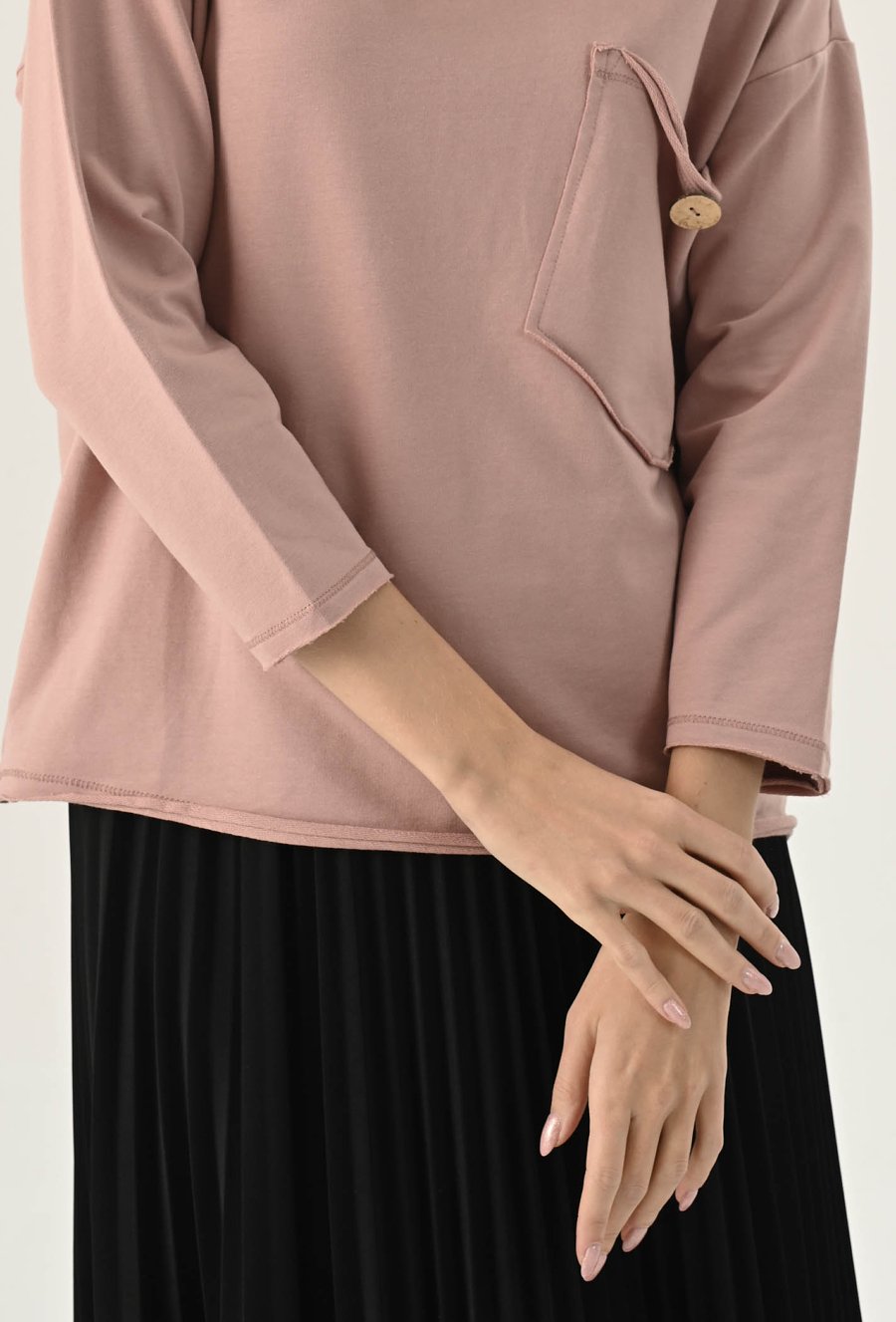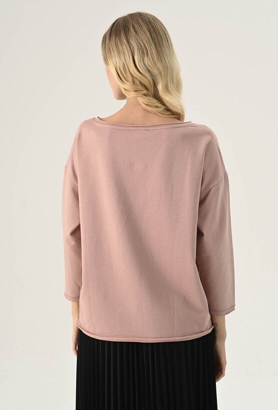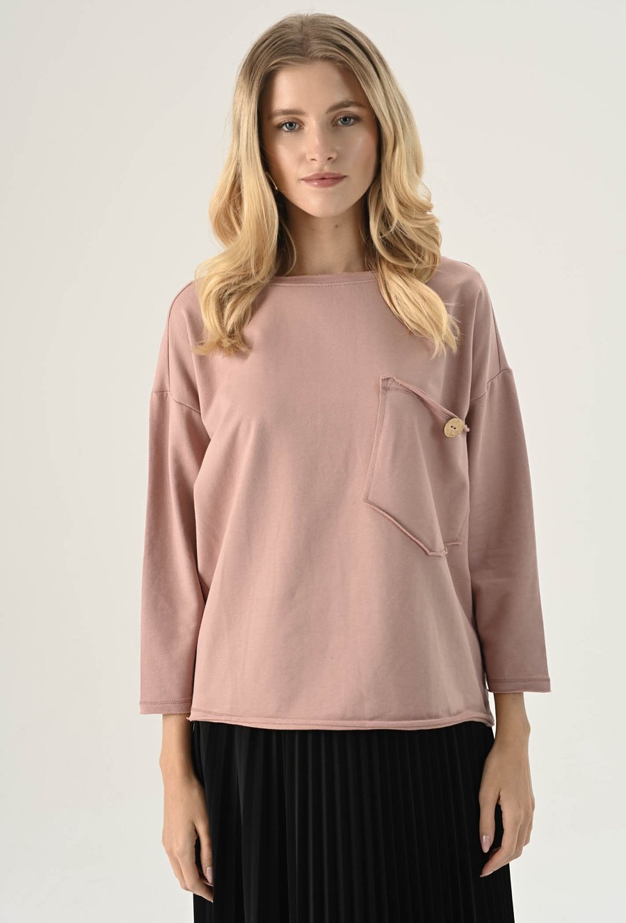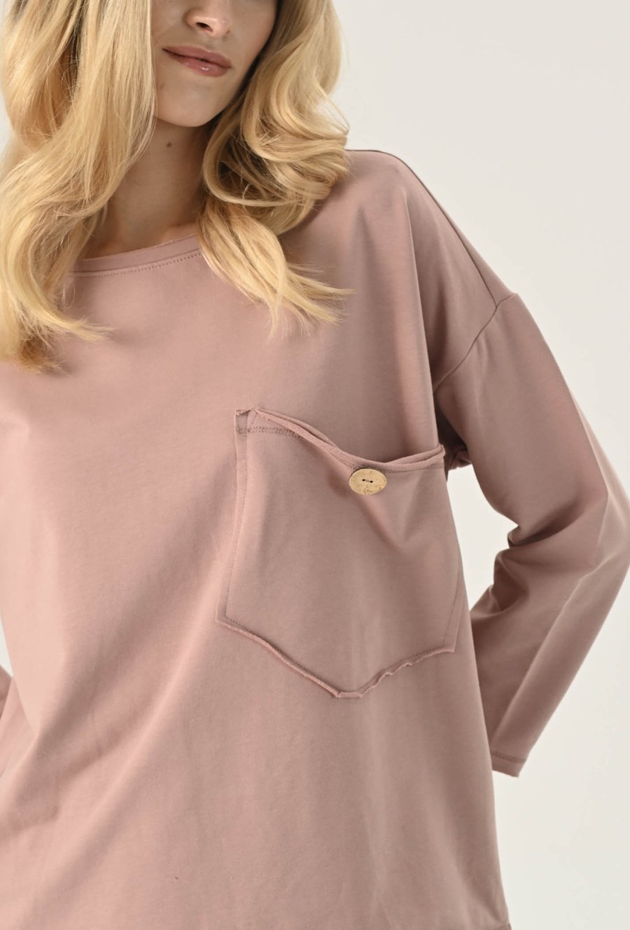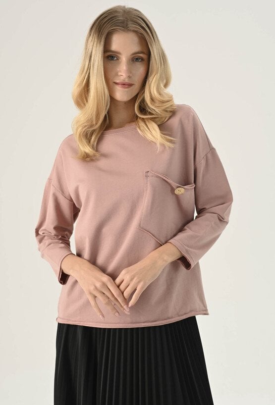 Bluza z ozdobną kieszeni w odcieniu ciepłego beżu. Posiada długi rękaw wraz z obniżoną linią ramion. Kieszeń posiada ozdobny guzik. Ten model będzie idealną propozycja na co dzień w zestawie z spodniami dresowymi lub jeansami. Modelka na zdjęciu ma 177 cm wzrostu i prezentuje rozmiar 36.