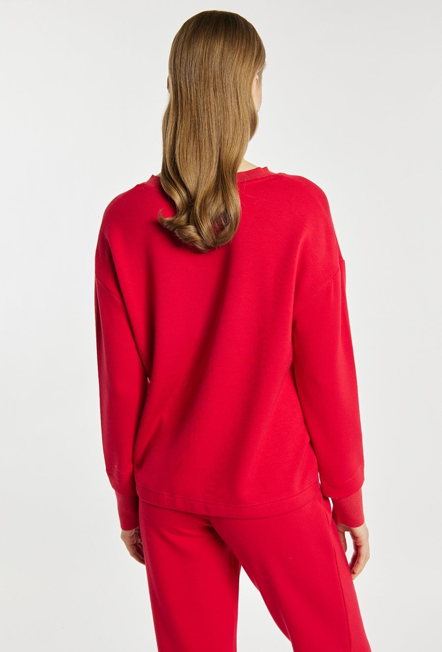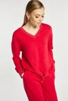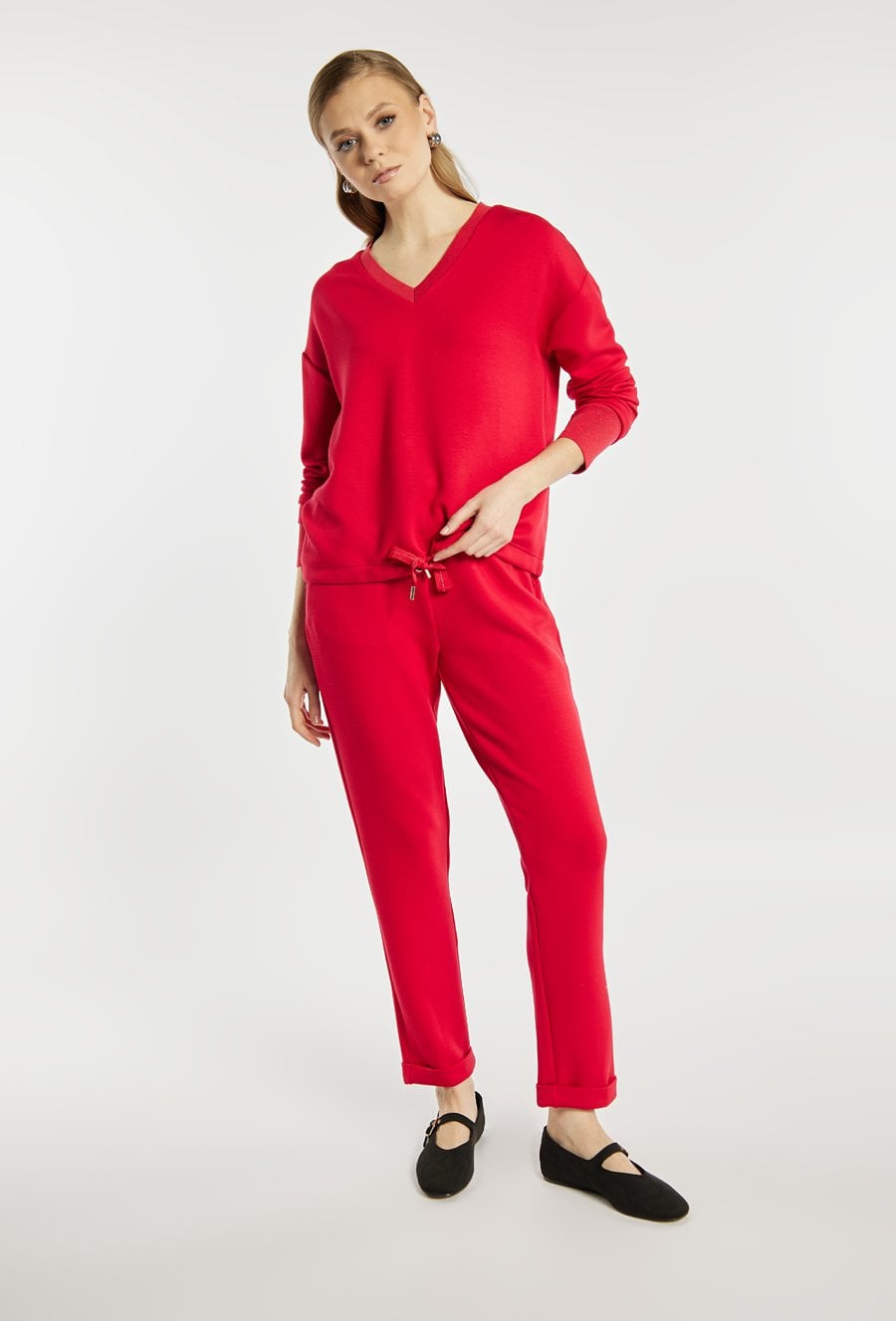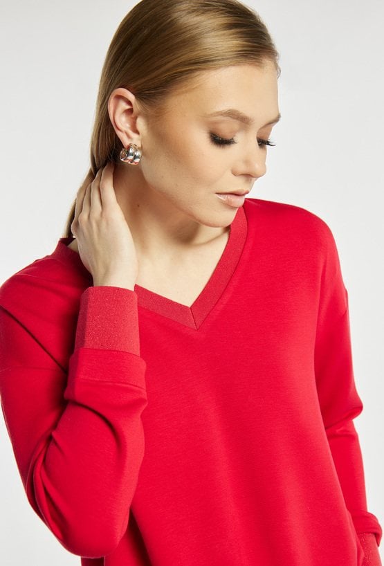 Bluza damska wykonana z miękkiego, przyjemnego w dotyku materiału. Bluza z dekoltem w serek, długim rękawem i wiązaniem na dole. Model polecamy zestawić z pasującymi spodniami, tworząc spójny i komfortowy komplet. Kod do spodni: 26W-TRU0650. Modelka na zdjęciu ma 177 cm wzrostu i prezentuje rozmiar S.