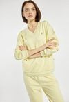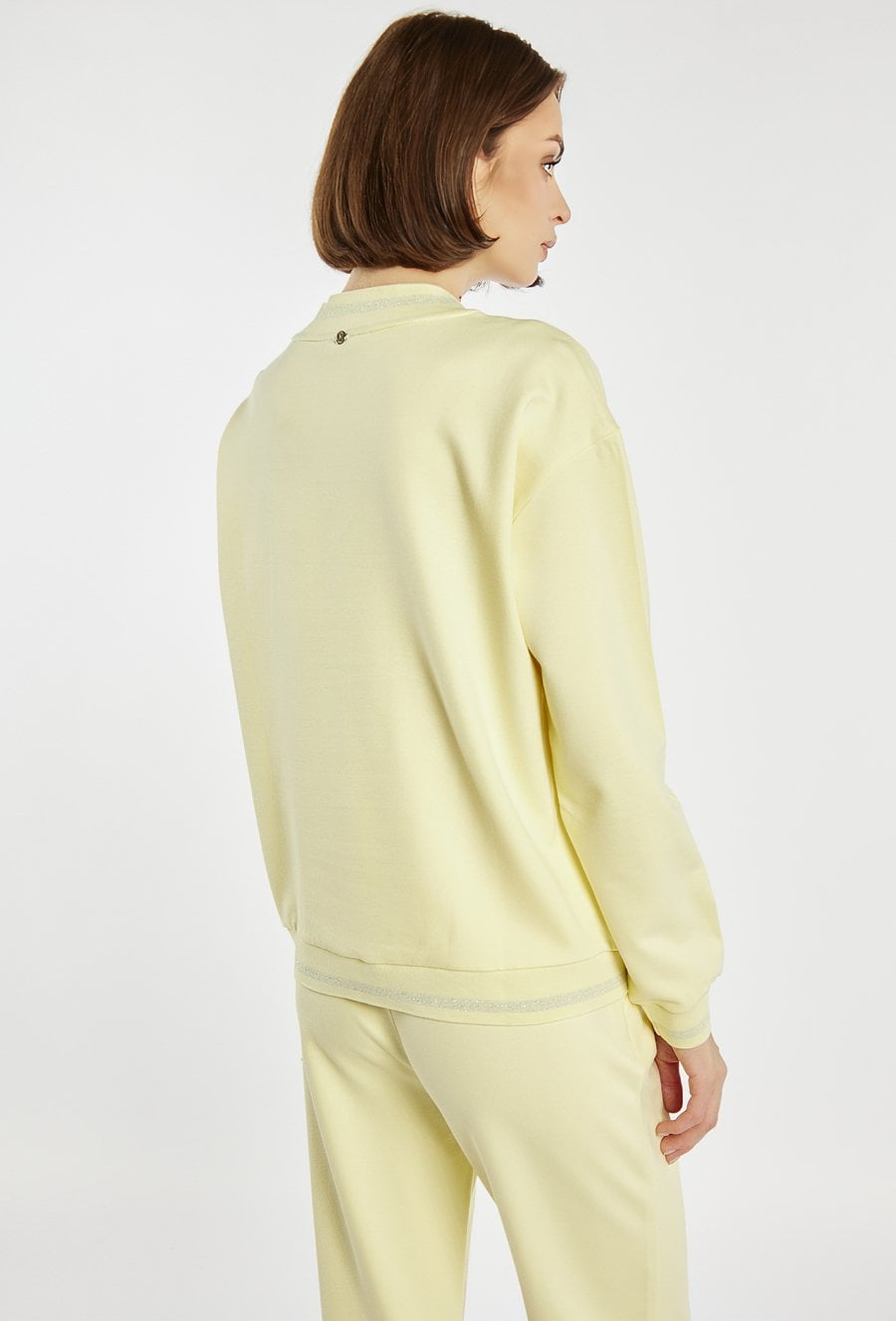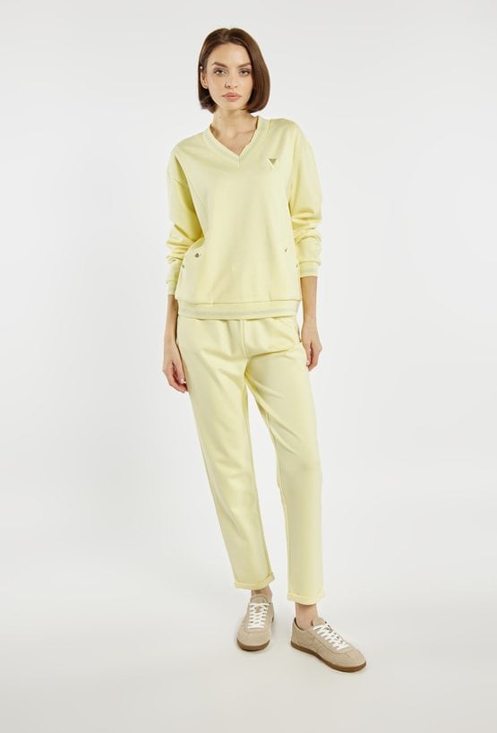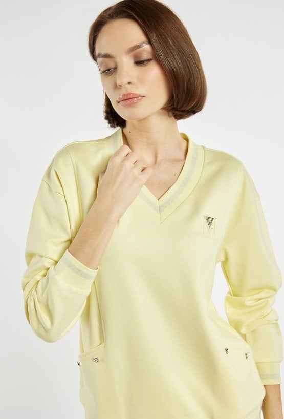 Bluza damska wykonana z miękkiego, przyjemnego w dotyku materiału. Bluza o luźnym kroju z dekoltem w serek, długimi rękawami i subtelnymi detalami przy kieszeniach sprawdzi się idealnie w codziennych stylizacjach. Model polecamy zestawić z pasującymi spodniami dresowymi, tworząc wygodny i spójny komplet. Kod do spodni: TRU0241. Modelka na zdjęciu ma 177 cm wzrostu i prezentuje rozmiar S.