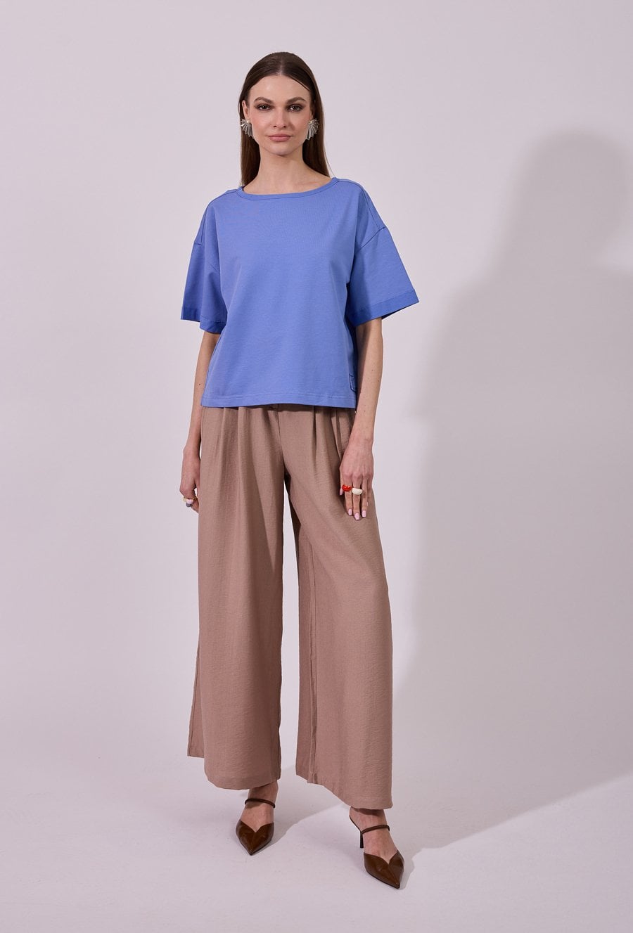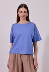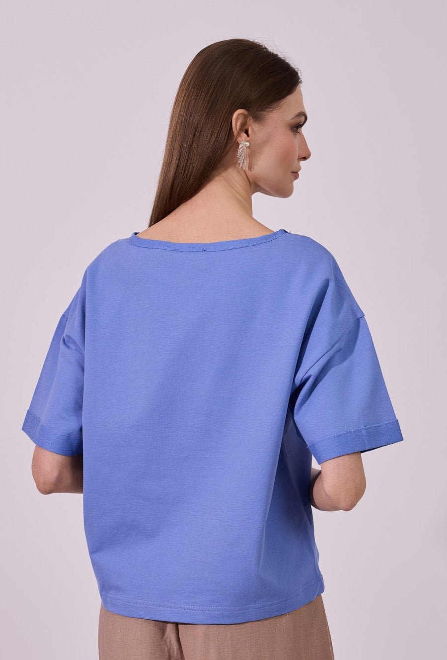 Bluza damska o swobodnym, komfortowym kroju. Model z krótkim rękawem oraz klasycznym, zaokrąglonym dekoltem. Prosty fason sprawia, że bluza jest uniwersalna i wygodna w noszeniu, a minimalistyczny design doskonale wpisuje się w codzienne stylizacje. Modelka na zdjęciu ma 177 cm wzrostu i prezentuje rozmiar S.