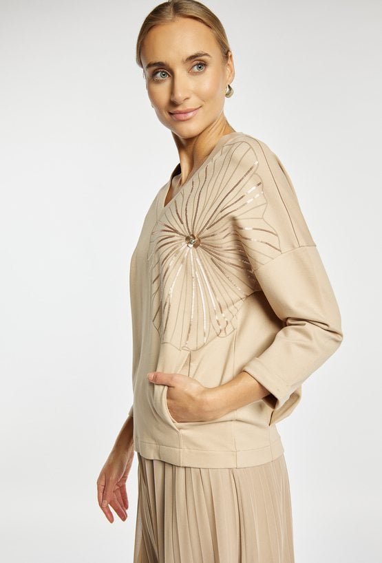 Bluza damska o kobiecym kroju to połączenie wygody i elegancji. Bluza z 3/4 rękawami i półokrągłym dekoltem ozdobiona jest dużym, błyszczącym motywem z aplikacją w formie kwiatu oraz posiada praktyczną kieszeń z przodu, która dodaje jej casualowego charakteru. Modelka na zdjęciu ma 177 cm wzrostu i prezentuje rozmiar S.