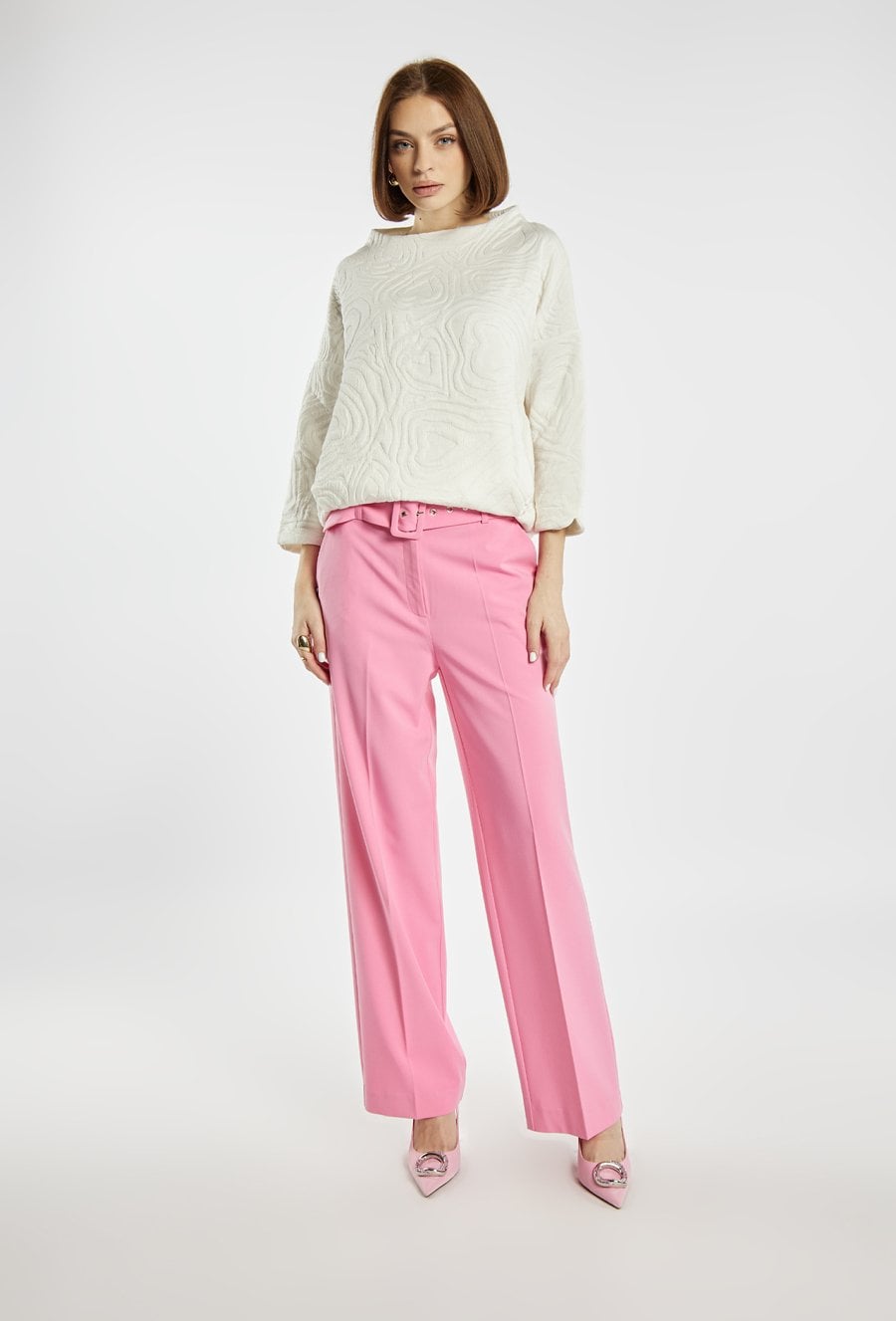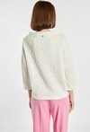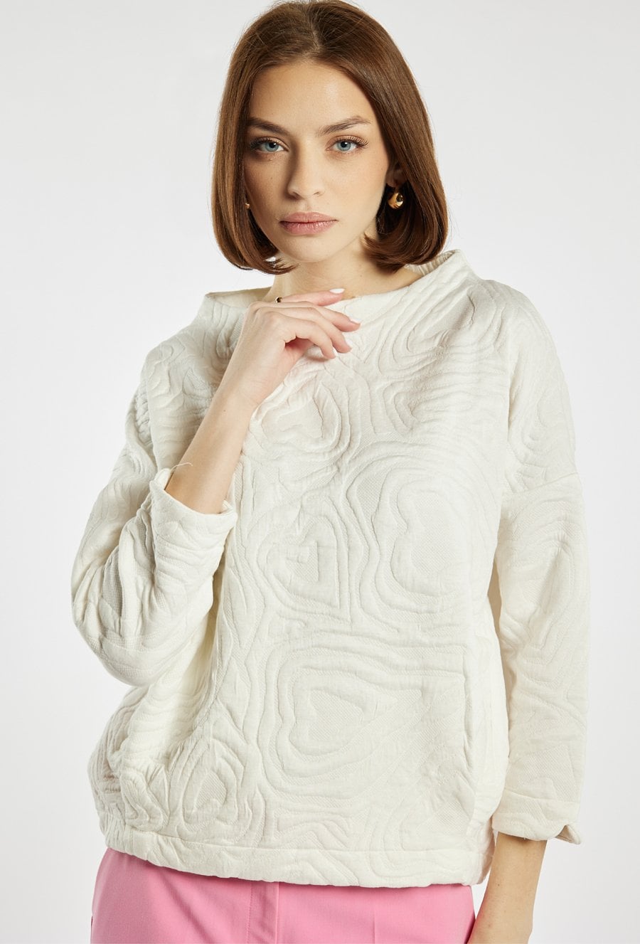Bluza damska o swobodnym, prostym kroju. Model z długim rękawem i klasycznym, okrągłym dekoltem, który zapewnia komfort noszenia. Jednolita kolorystyka w połączeniu z delikatnym wzorem nadaje całości nowoczesnego, a jednocześnie kobiecego charakteru. Bluza dobrze układa się na sylwetce i świetnie sprawdzi się w codziennych stylizacjach, zarówno ze spodniami, jak i spódnicą. Modelka na zdjęciu ma 177 cm wzrostu i prezentuje rozmiar S