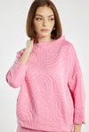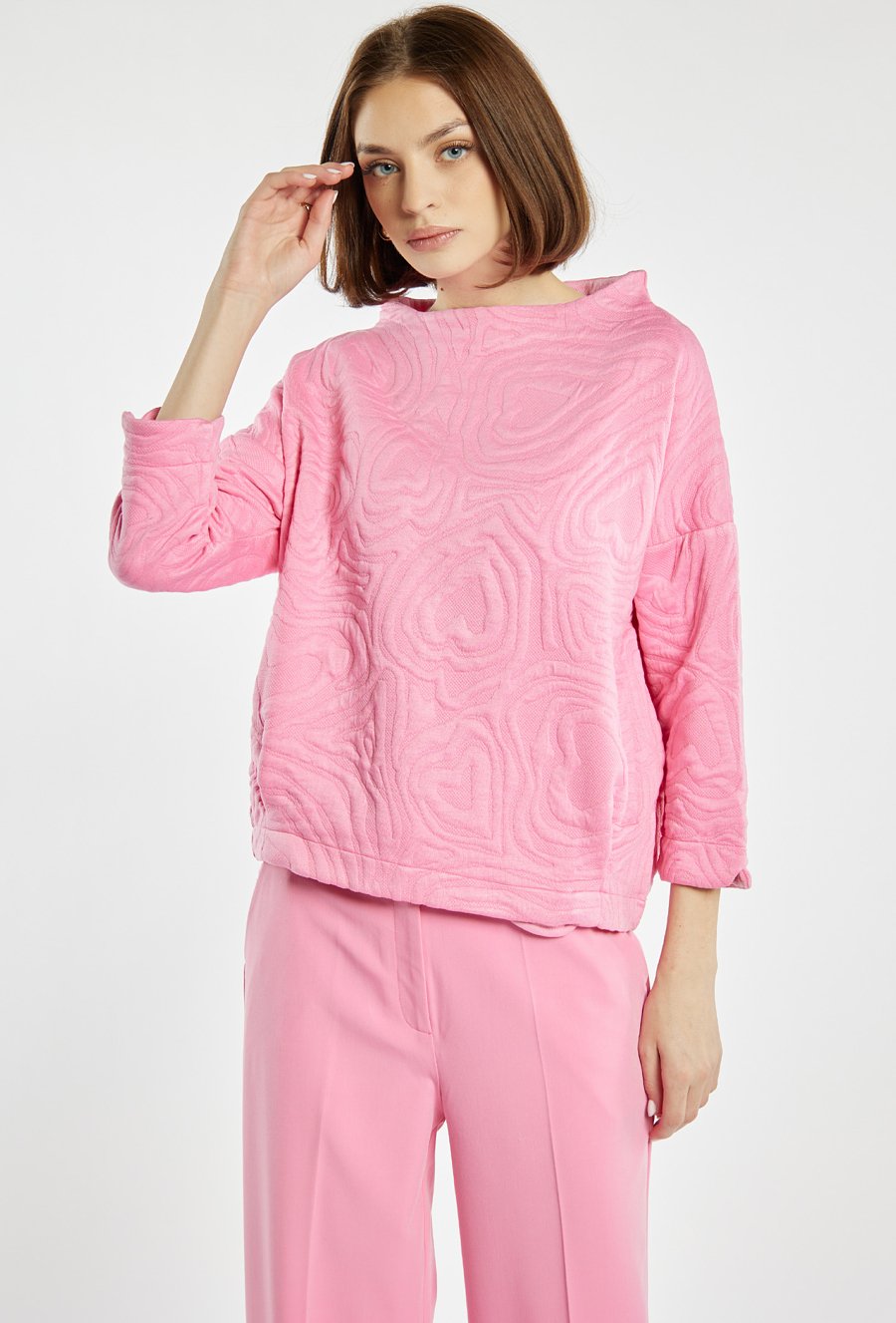 Bluza damska o swobodnym, prostym kroju. Model z długim rękawem i klasycznym, okrągłym dekoltem, który zapewnia komfort noszenia. Jednolita kolorystyka w połączeniu z delikatnym wzorem nadaje całości nowoczesnego, a jednocześnie kobiecego charakteru. Bluza dobrze układa się na sylwetce i świetnie sprawdzi się w codziennych stylizacjach, zarówno ze spodniami, jak i spódnicą. Modelka na zdjęciu ma 177 cm wzrostu i prezentuje rozmiar S