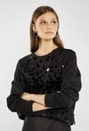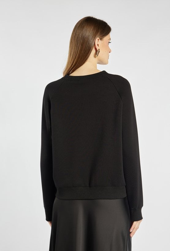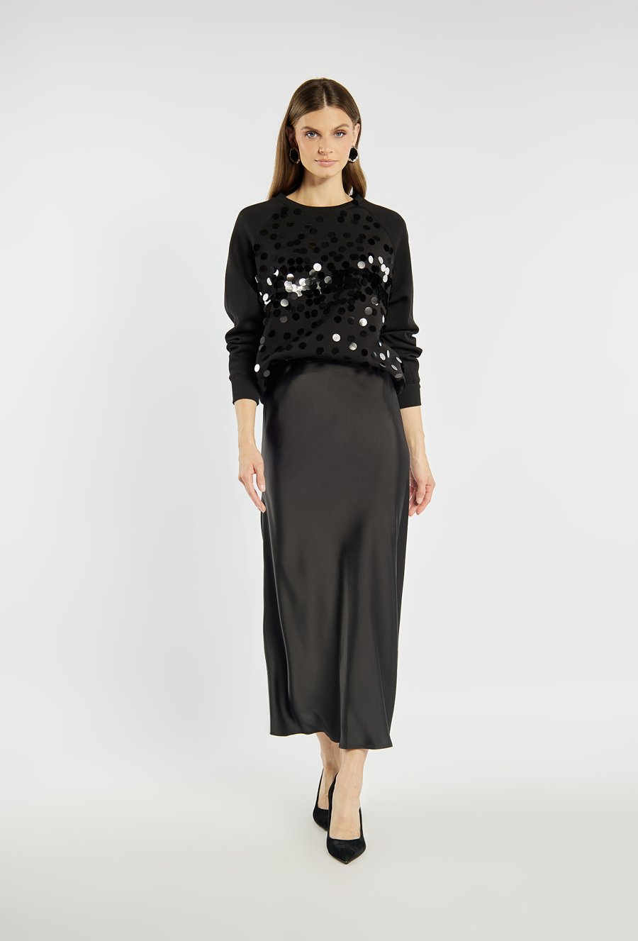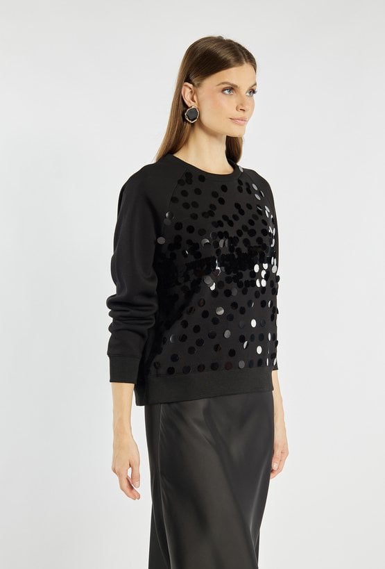 Bluza damska zdobiona dużymi cekinami w kontrastujących odcieniach czerni i srebra, które tworzą efektowny, świetlisty wzór. Bluza z długimi rękawami i półokrągłym dekoltem. Idealna propozycja na święta, sylwestra lub spotkania w gronie przyjaciół. Modelka na zdjęciu ma 177 cm wzrostu i prezentuje rozmiar S.