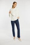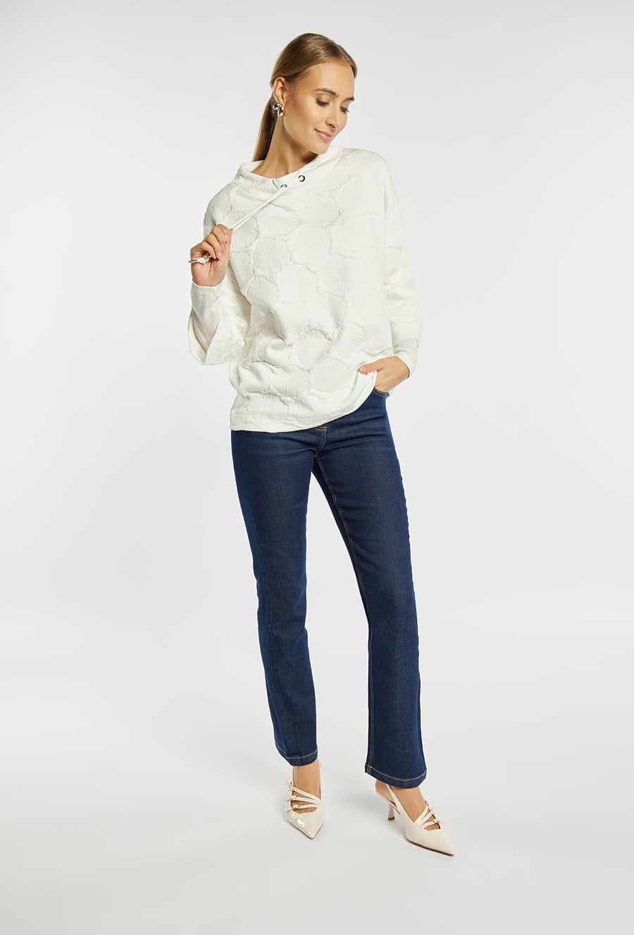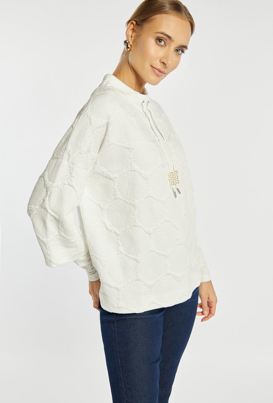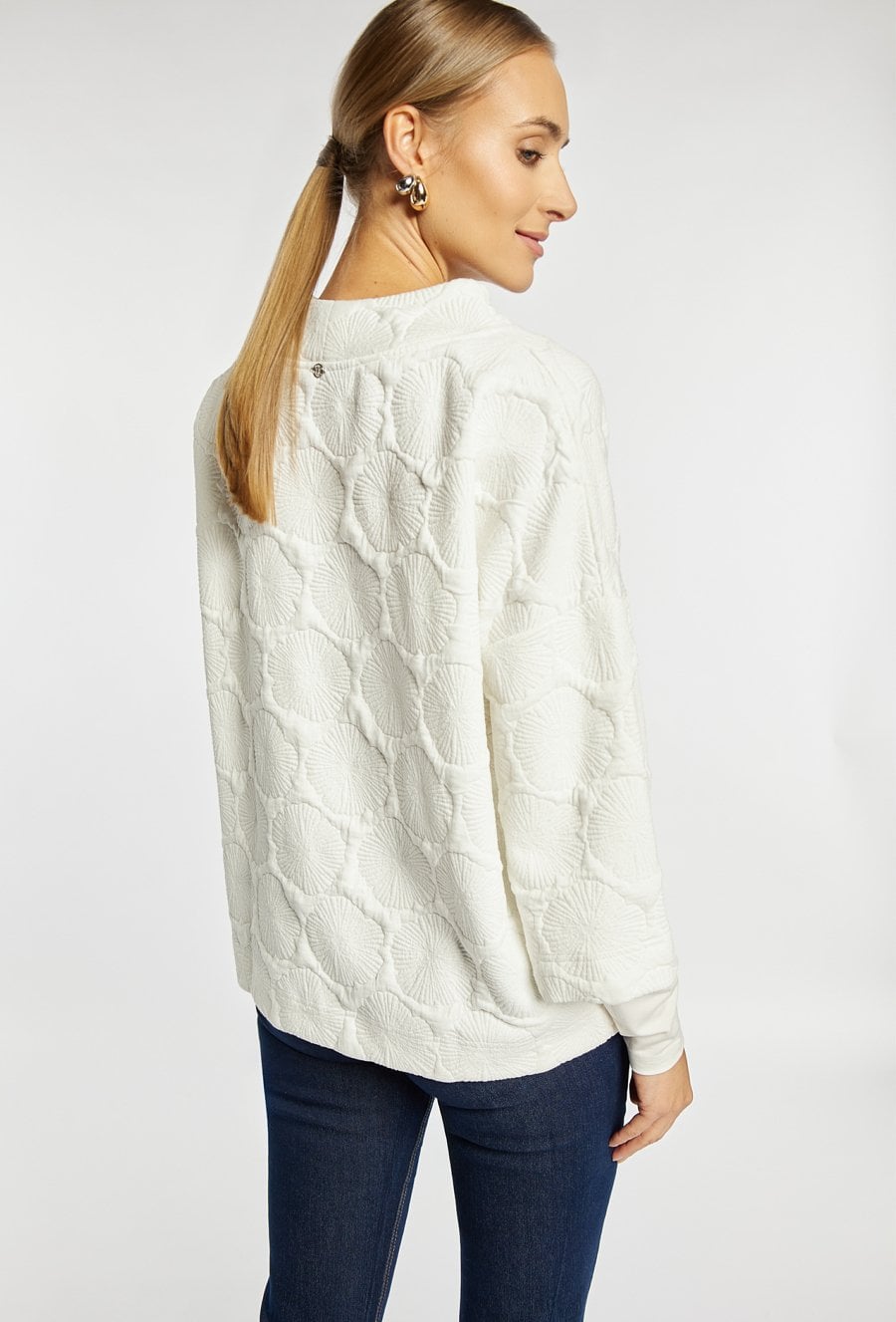 Bluza o efektownej, tłoczonej strukturze w kwiatowe motywy. Swobodny fason zapewnia komfort noszenia, a szerokie rękawy dodają lekkości całej stylizacji. Model wyróżniają troczki z ozdobnymi perełkami, które dodają subtelnego akcentu. Idealna na co dzień, do jeansów i prostych spodni. Modelka na zdjęciu ma 177 cm wzrostu i prezentuje rozmiar S.