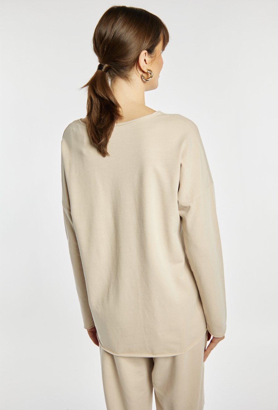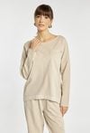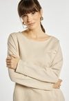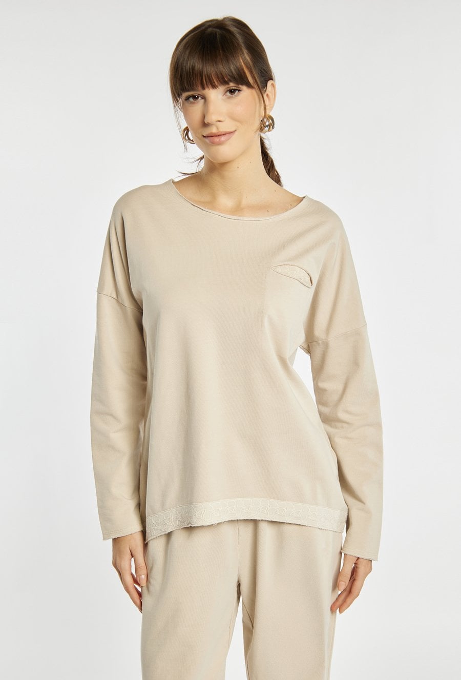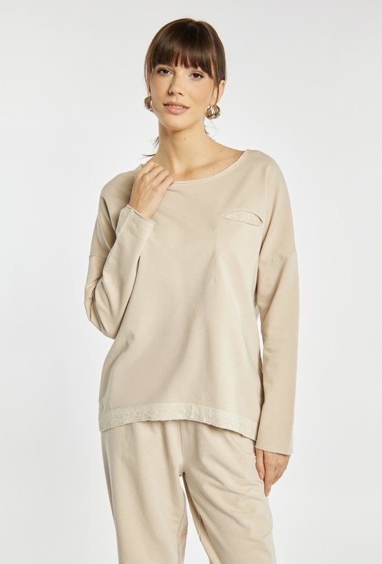 Bluza damska o luźnym, komfortowym kroju. Bluza ma długie rękawy, delikatny dekolt oraz naszywaną kieszonkę z dekoracyjnym wykończeniem. Bluza wyróżnia się subtelną koronkową wstawką przy dolnej krawędzi, co dodaje jej kobiecego charakteru. Idealna do codziennych, wygodnych stylizacji. Modelka na zdjęciu ma 177 cm wzrostu i prezentuje rozmiar S.