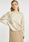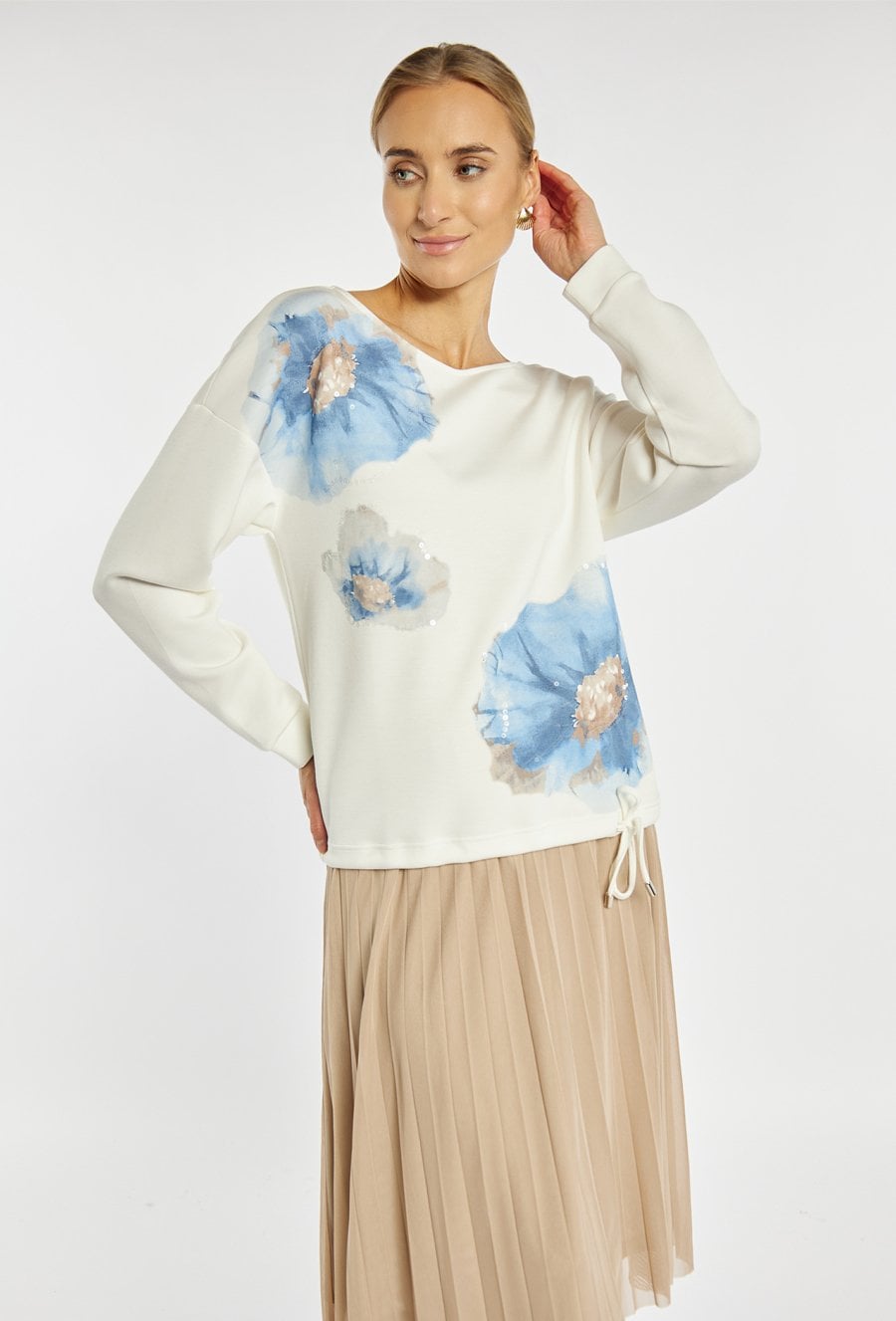 Bluza o kobiecym charakterze to połączenie wygody i delikatnego stylu. Bluza z długimi rękawami i półokrągłym dekoltem wykonana z przyjemnego w dotyku materiału, ozdobiona jest dużymi kwiatowymi nadrukami z subtelnym połyskiem oraz ściągaczem u dołu z troczkiem, który pozwala dopasować fason do sylwetki. Modelka na zdjęciu ma 177 cm wzrostu i prezentuje rozmiar S.