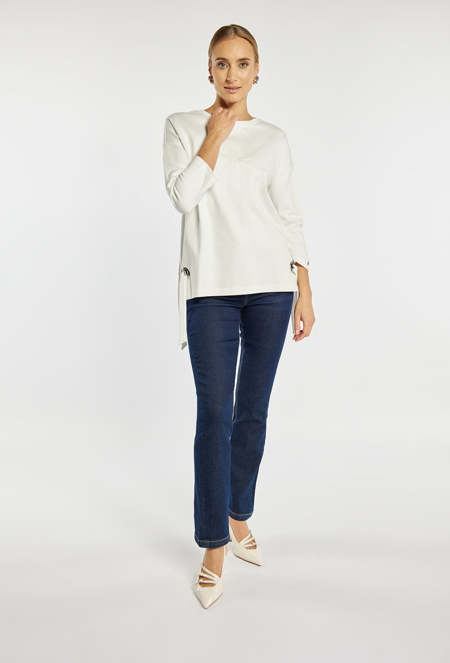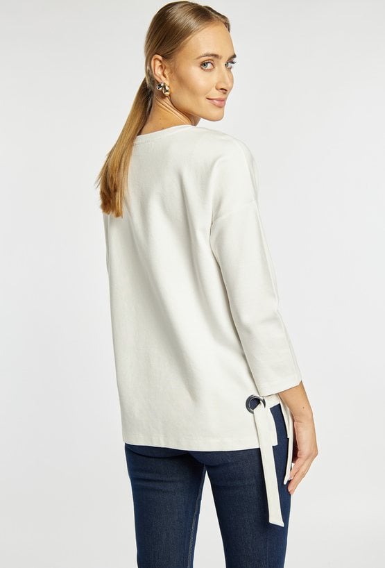 Bluza o swobodnym kroju z dekoracyjnym haftem z przodu. Po bokach znajdują się metalowe oczka z wszytymi tasiemkami, które dodają nowoczesnego akcentu i pozwalają delikatnie regulować dół. Prosty rękaw i miękki materiał sprawiają, że model dobrze układa się na sylwetce i sprawdza się w codziennych, komfortowych stylizacjach. Modelka na zdjęciu ma 177 cm wzrostu i prezentuje rozmiar S.