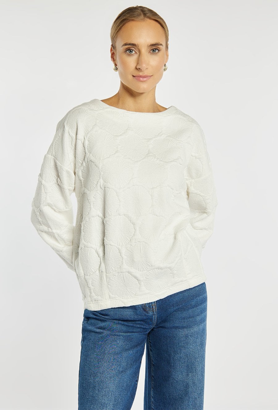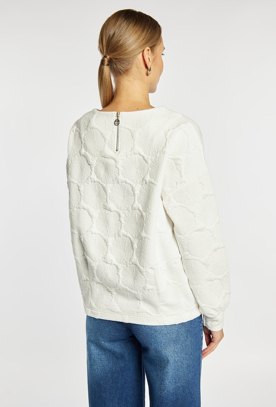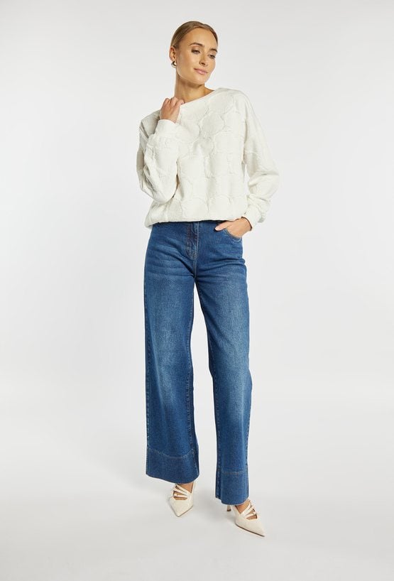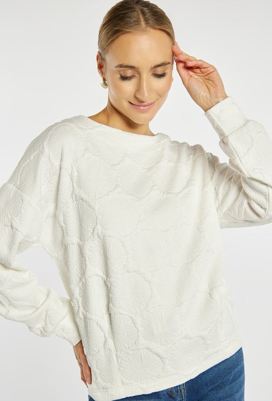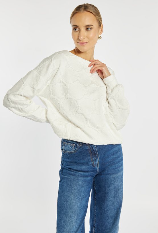 Bluza o swobodnym kroju to wygodna i stylowa propozycja na co dzień. Bluza z długimi rękawami i półokrągłym dekoltem wyróżnia się tłoczonym wzorem w formie kwiatowych motywów oraz krótkim suwakiem z tyłu, który dodaje jej nowoczesnego charakteru. Modelka na zdjęciu ma 177 cm wzrostu i prezentuje rozmiar S.