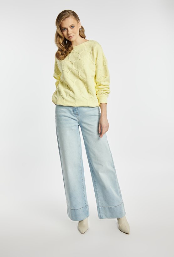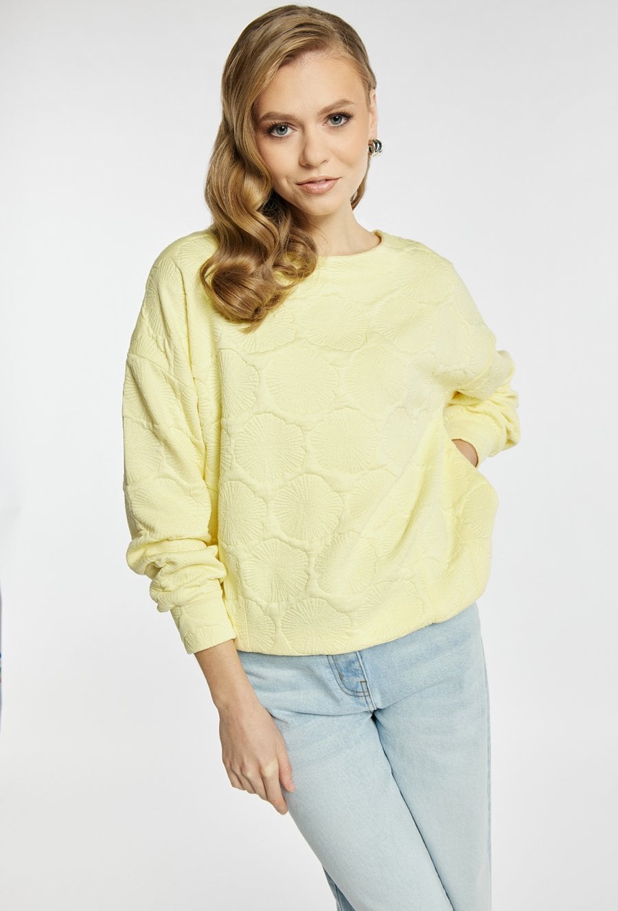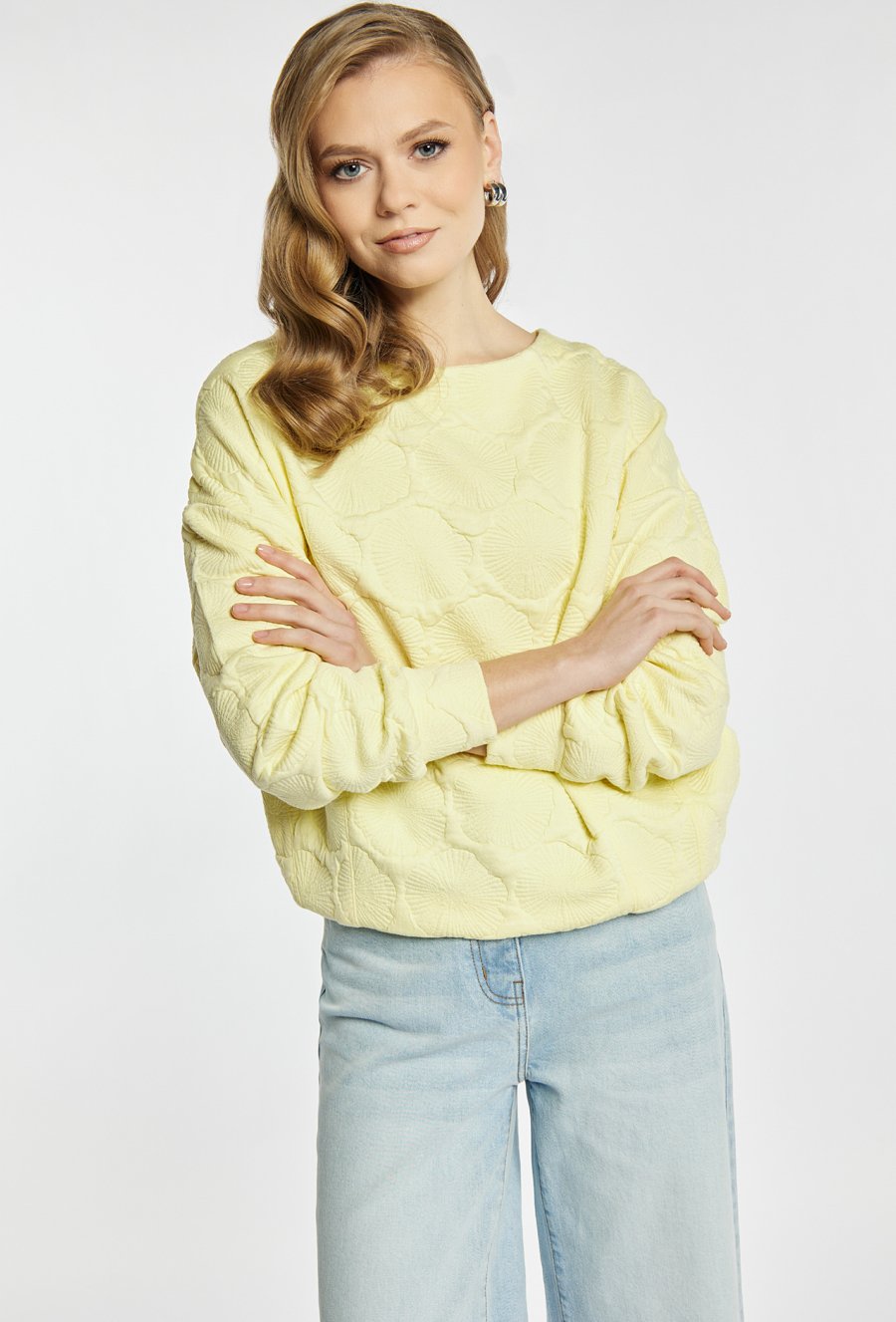 Bluza o swobodnym kroju to wygodna i stylowa propozycja na co dzień. Bluza z długimi rękawami i półokrągłym dekoltem wyróżnia się tłoczonym wzorem w formie kwiatowych motywów oraz krótkim suwakiem z tyłu, który dodaje jej nowoczesnego charakteru. Modelka na zdjęciu ma 177 cm wzrostu i prezentuje rozmiar S.