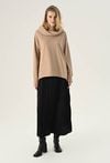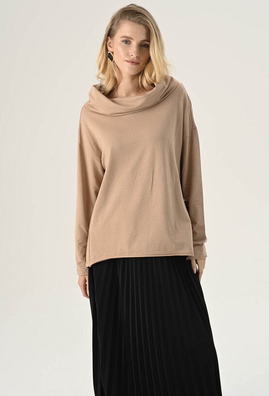 Bluza w pięknym beżowym kolorze z szeroką stójką Posiada długi rękaw wraz z obniżoną linią ramion oraz surowe wykończenie. Ten model będzie idealną propozycja na co dzień w zestawie z spodniami dresowymi lub jeansami. Modelka na zdjęciu ma 177 cm wzrostu i prezentuje rozmiar 36.