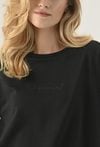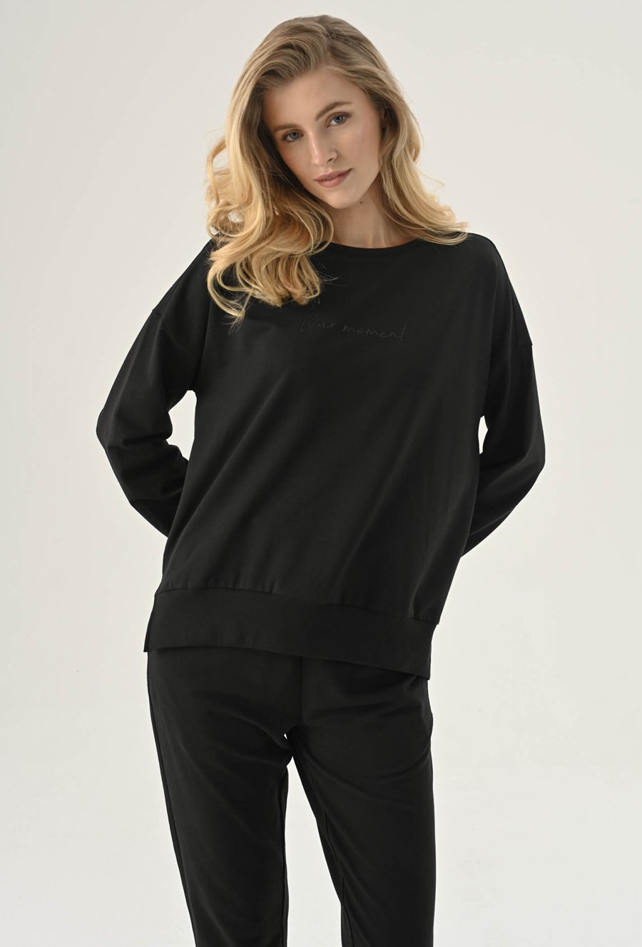 Bluzka w klasycznym fasonie, wykonana z przyjemnej w dotyku dzianiny bawełnianej. Na przodzie znajduje się ozdobna aplikacja. Bluza posiada okrągły dekolt, długi rękaw i brzegi wykończone ściągaczami. Idealnie sprawdzi się w codziennych stylizacjach.Modelka na zdjęciu ma 174 cm wzrostu i prezentuje rozmiar 36.