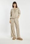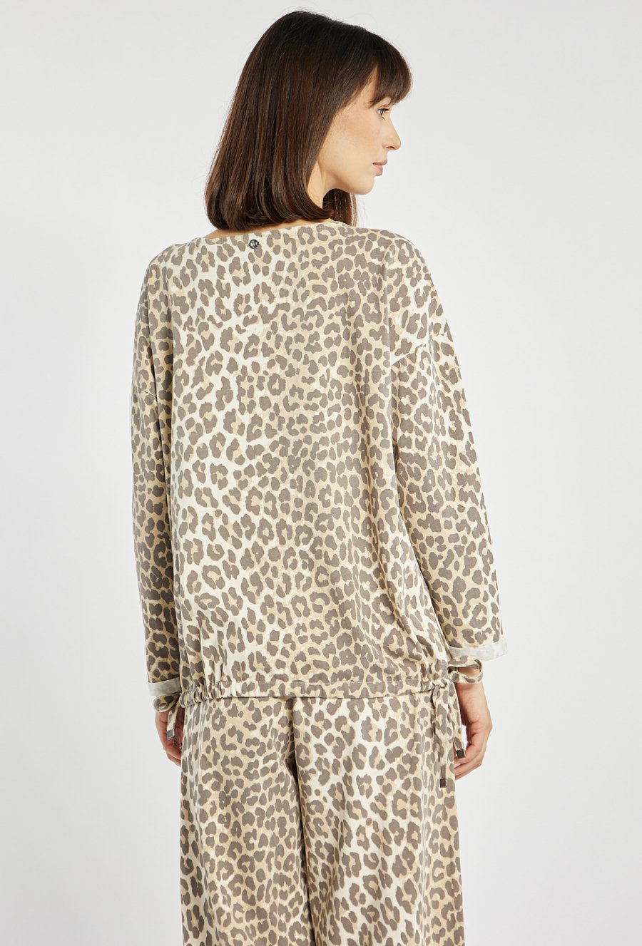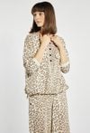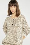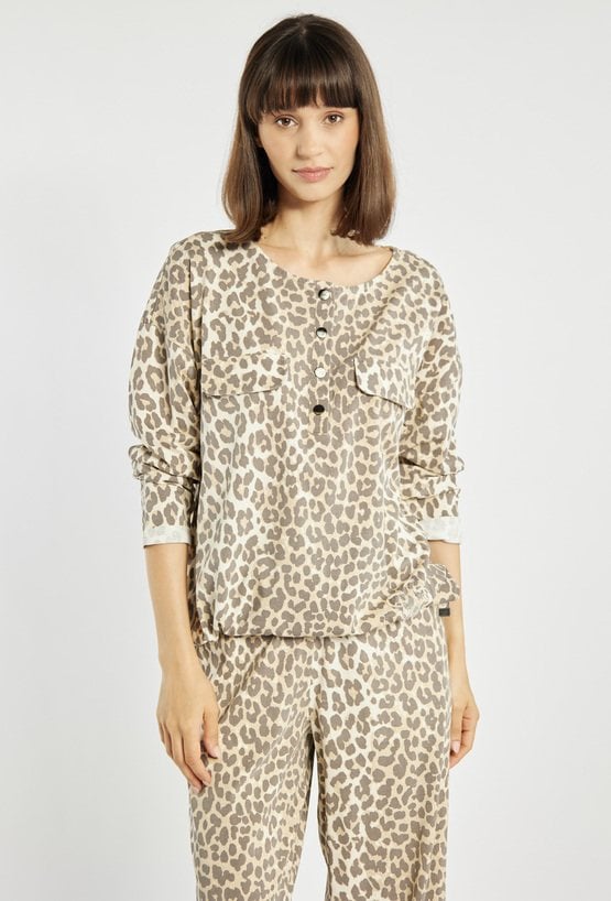 Bluza damska z motywem w panterkę. Model z długimi rękawami oraz dekoltem zapinanym na guziki. Z przodu kieszeń z klapką, nadająca całości casualowego charakteru. Idealna propozycja na co dzień. Polecamy zestawić ze spodniami z tej samej kolekcji, tworząc modny i wygodny komplet. Kod do spodni: 25J-TRU2261. Modelka na zdjęciu ma 177 cm wzrostu i prezentuje rozmiar S