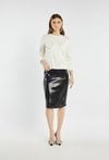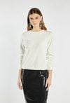 Bluza o prostym, eleganckim kroju z delikatnym zdobieniem w postaci aplikacji przypiętej na agrafkę. Minimalistyczny design w połączeniu z ozdobnym detalem nadaje jej wyjątkowego charakteru. Świetnie sprawdzi się zarówno na co dzień, jak i w świątecznych czy sylwestrowych stylizacjach. Modelka na zdjęciu ma 177 cm wzrostu i prezentuje rozmiar S.
