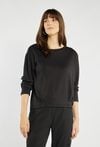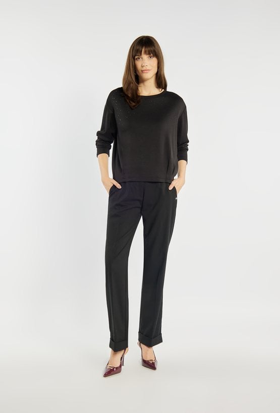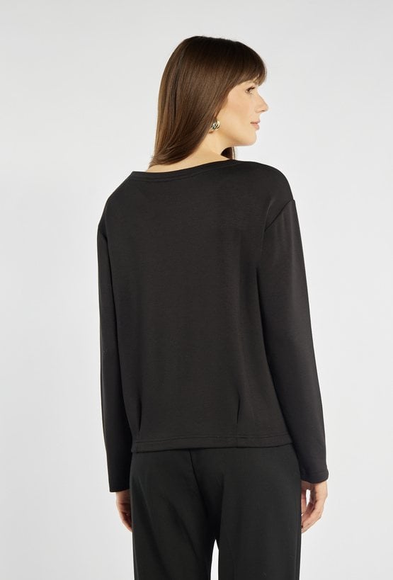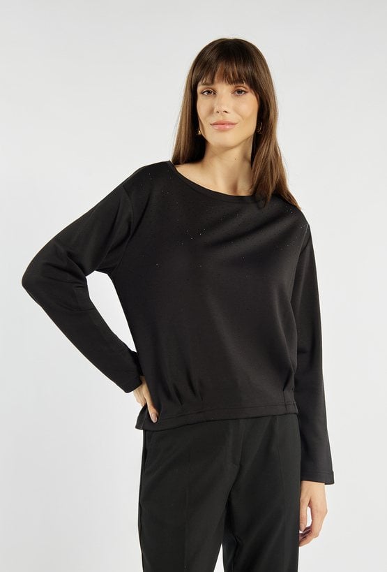Bluza o swobodnym kroju, ozdobiona subtelnymi, błyszczącymi aplikacjami w górnej części, które dodają jej eleganckiego charakteru. Bluza doskonale sprawdzi się zarówno w codziennych stylizacjach, jak i w bardziej szykownych zestawieniach. Modelka na zdjęciu ma 177 cm wzrostu i prezentuje rozmiar 36.