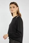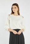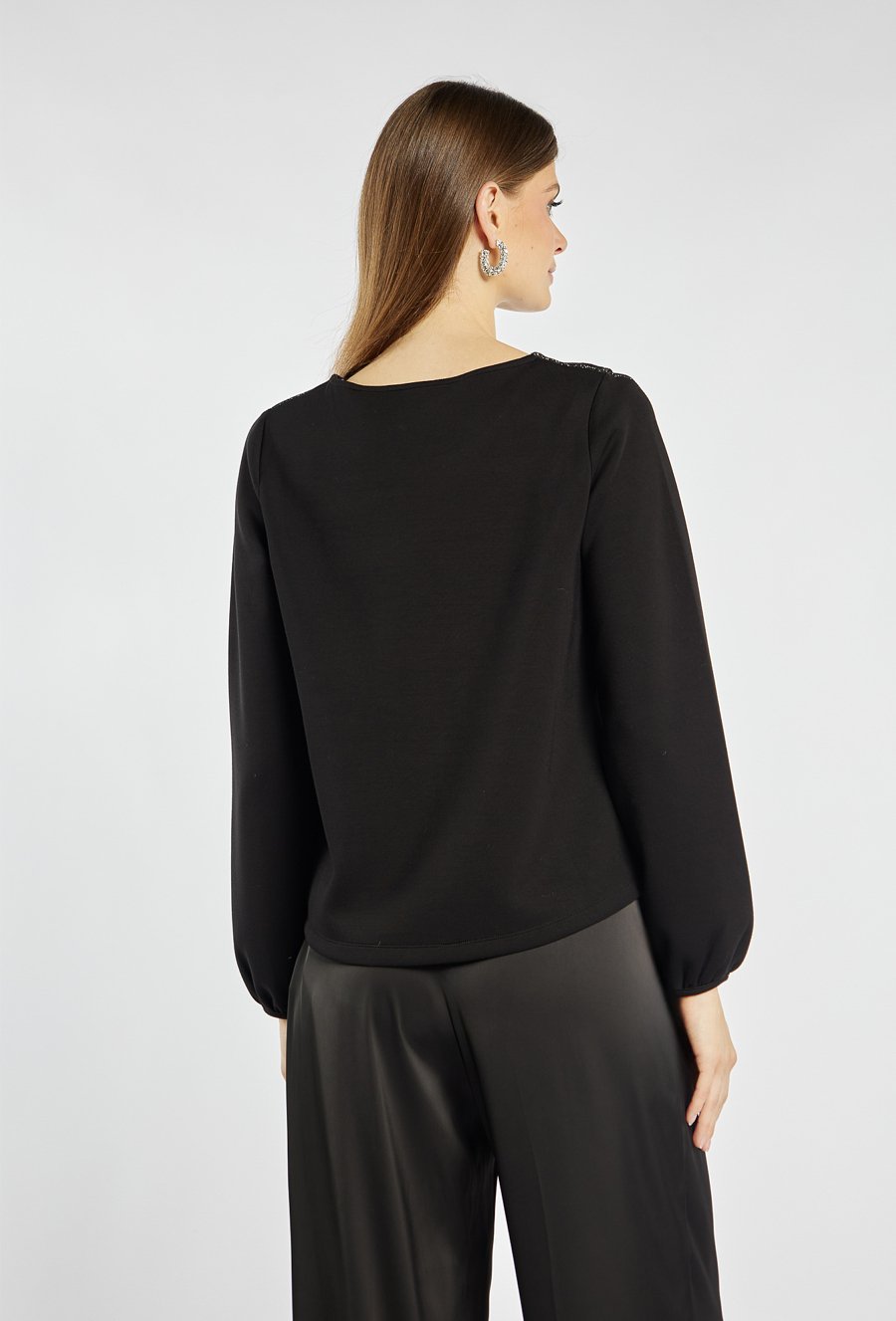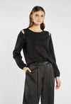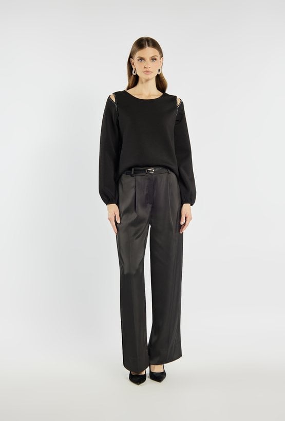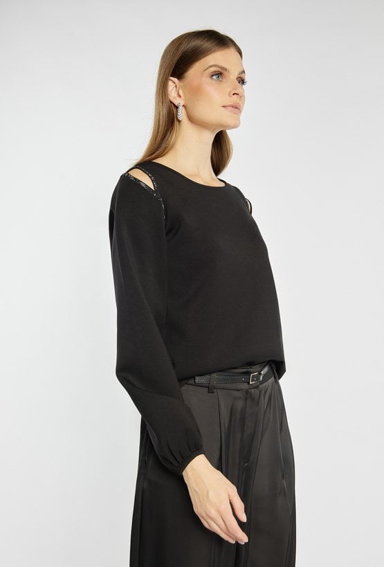 Bluza o eleganckim charakterze z efektownymi wycięciami na ramionach, subtelnie ozdobionymi błyszczącą lamówką. Idealna na święta lub wieczorne wyjście. Modelka na zdjęciu ma 177 cm wzrostu i prezentuje rozmiar S.