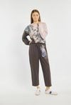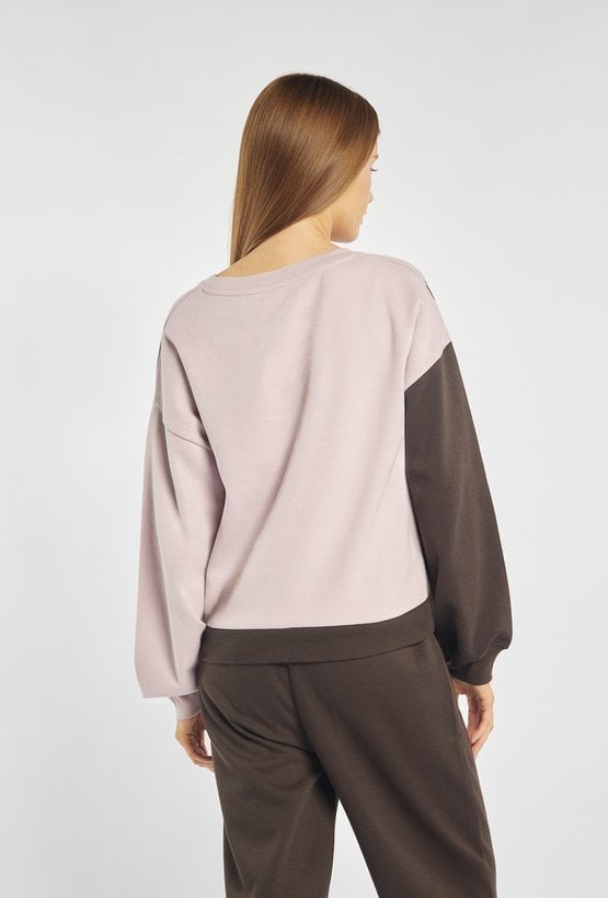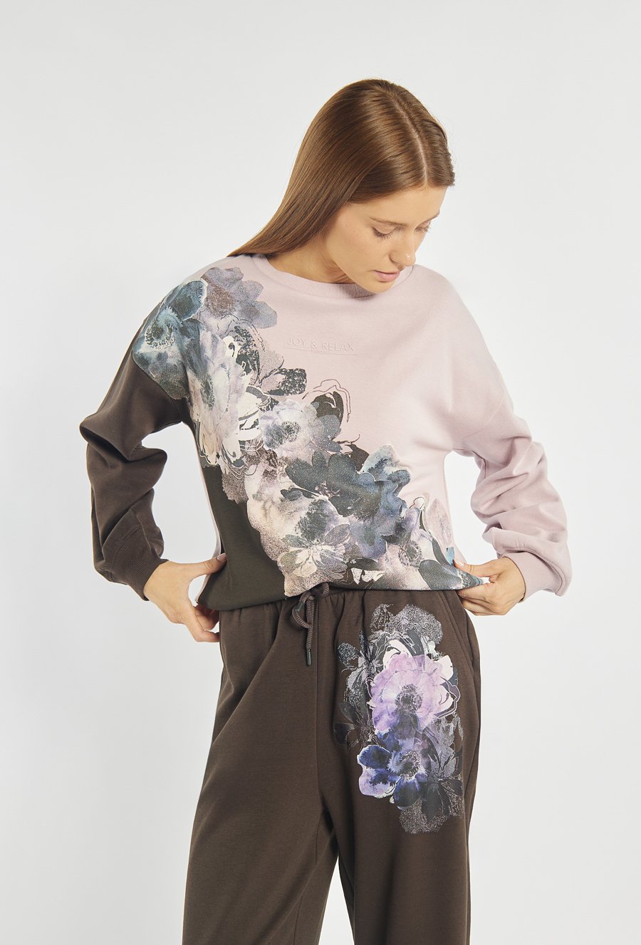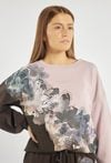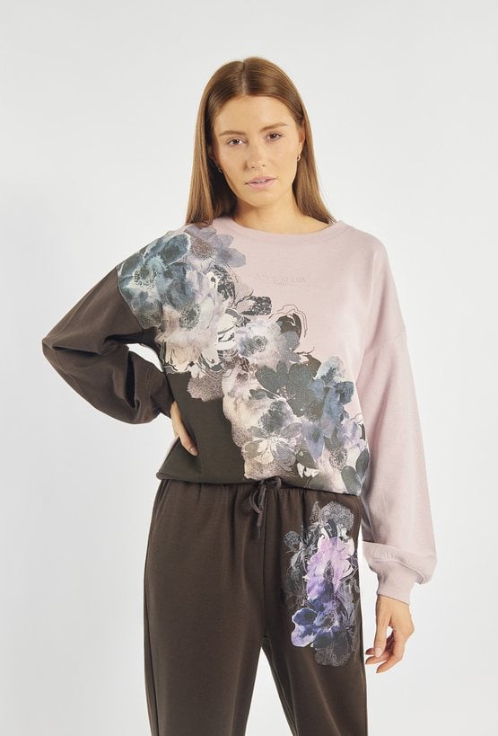 Bluza z kolekcji Joy&Relax w wyjątkowym, asymetrycznym zestawieniu kolorów. Przód zdobi duży, kwiatowy nadruk w odcieniach błękitu i szarości, który nadaje całości artystycznego charakteru. Model o swobodnym kroju, z okrągłym dekoltem i długimi rękawami, zapewnia wygodę i styl w codziennych stylizacjach. Modelka na zdjęciu ma 177 cm wzrostu i prezentuje rozmiar S.