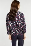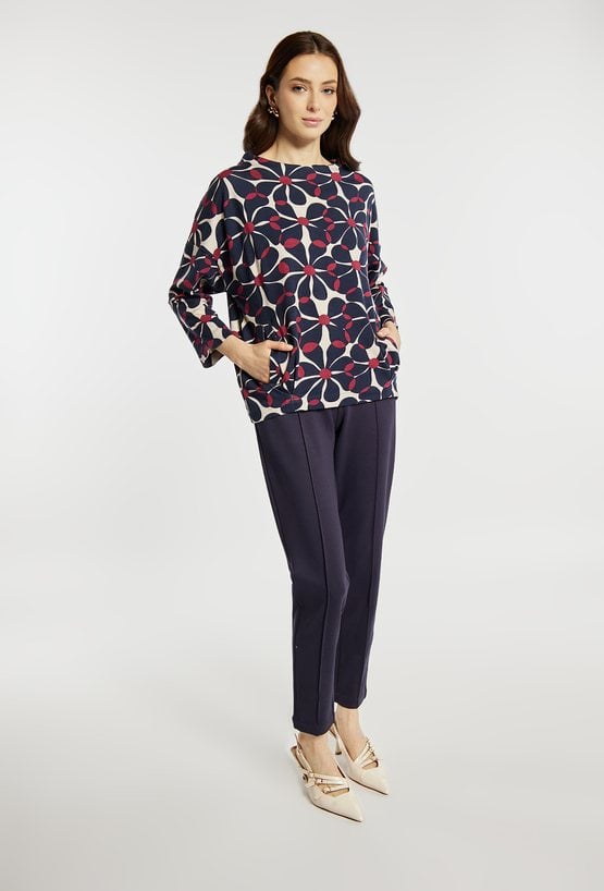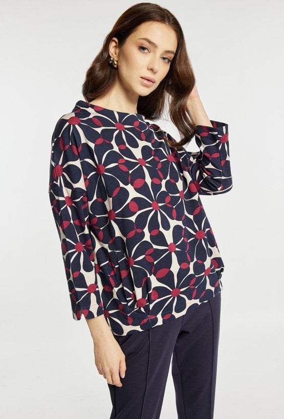 Bluza o swobodnym kroju, z delikatnym dekoltem w łódkę, który subtelnie podkreśla linię szyi. Bluza wyróżnia się wyrazistym, geometryczno-kwiatowym wzorem, który nadaje całości nowoczesnego charakteru. Bluza sprawdzi się na co dzień, do pracy oraz w casualowych stylizacjach. Modelka na zdjęciu ma 177 cm wzrostu i prezentuje rozmiar S.