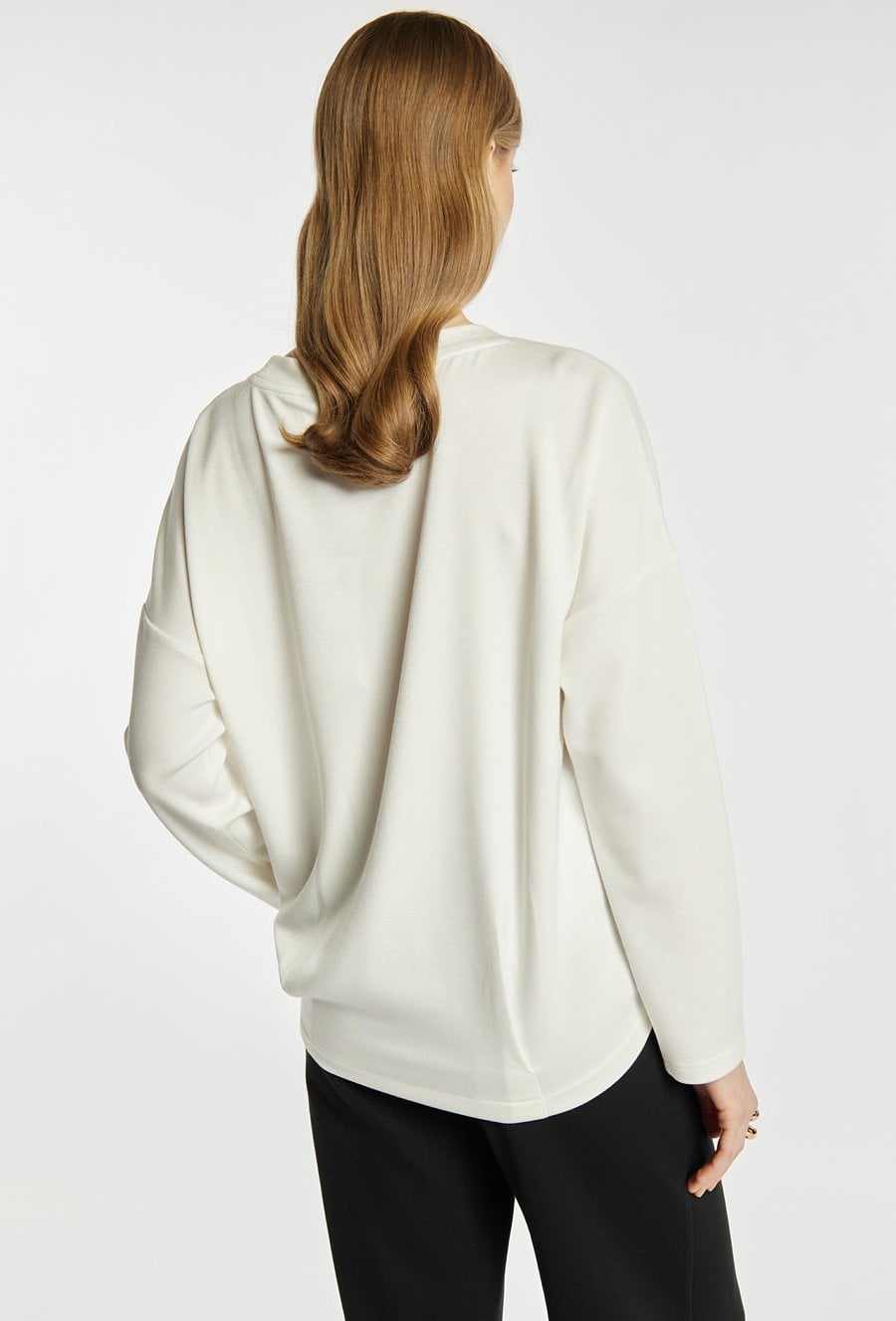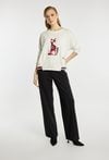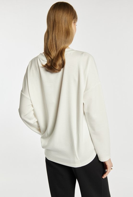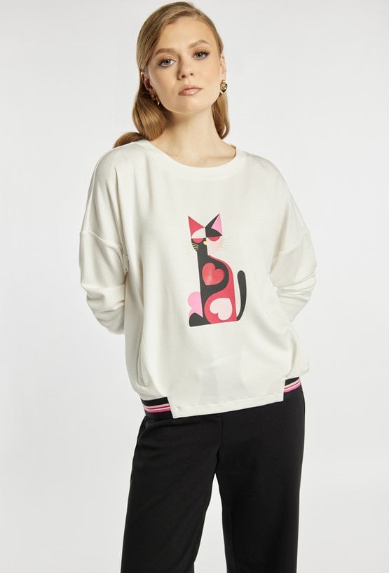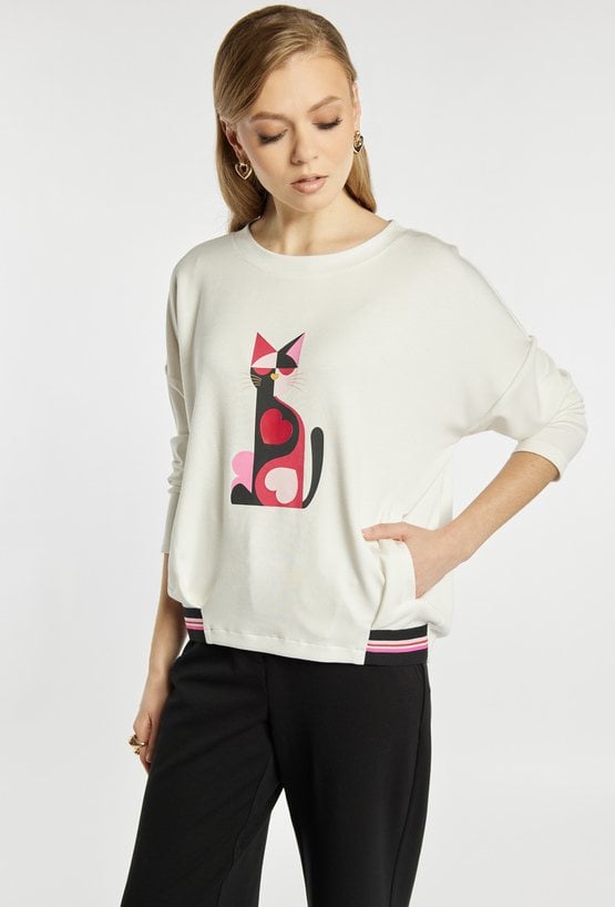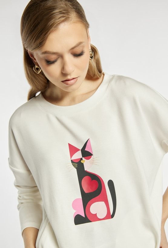 Bluza damska wykonana z miękkiego, komfortowego materiału. Bluza o luźnym kroju i długich rękawach wyróżnia się kolorowym, geometrycznym motywem kota z sercami, który dodaje stylizacji lekkości i artystycznego charakteru. Model idealny na co dzień. Modelka na zdjęciu 177 cm wzrostu i prezentuje rozmiar S.