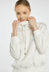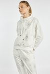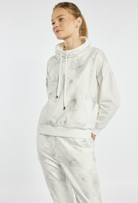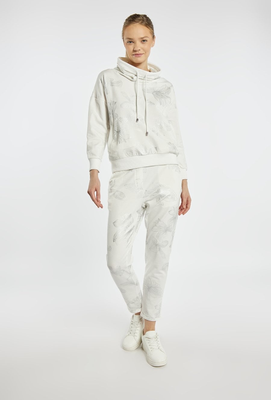 Bluza o sportowo-casualowym charakterze. Model z kapturem i regulacją na troczki, z delikatnym, subtelnym nadrukiem, który nadaje całości lekkiego i kobiecego wyrazu. Bluza sprawdzi się na co dzień, w stylizacjach wypoczynkowych i casualowych, można ją zestawić z pasującymi spodniami dresowymi z tej samej kolekcji. Modelka na zdjęciu ma 177 cm wzrostu i prezentuje rozmiar S.
